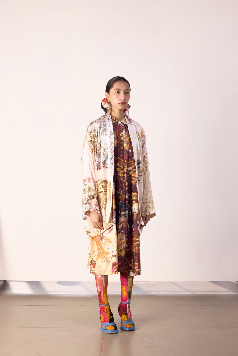 A relaxed, open-front jacket crafted in a soft pastel floral print.