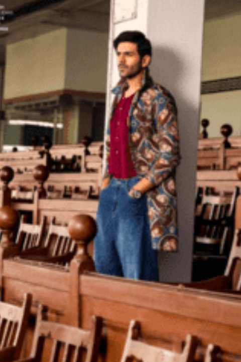 Full sleeve button down jacket in jacquard fabric in hues of maroon, blue and brown.
