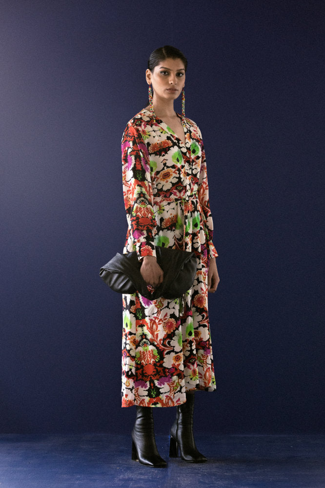 Vintage story Button down shirt dress with detachable belt Fabric- Silk Soft hand feel Dress is sold as separate Relaxed fit The print placement will vary from piece to piece. SHIPPING & DELIVERY Shipped in 10 DAYS CARE DRY CLEAN