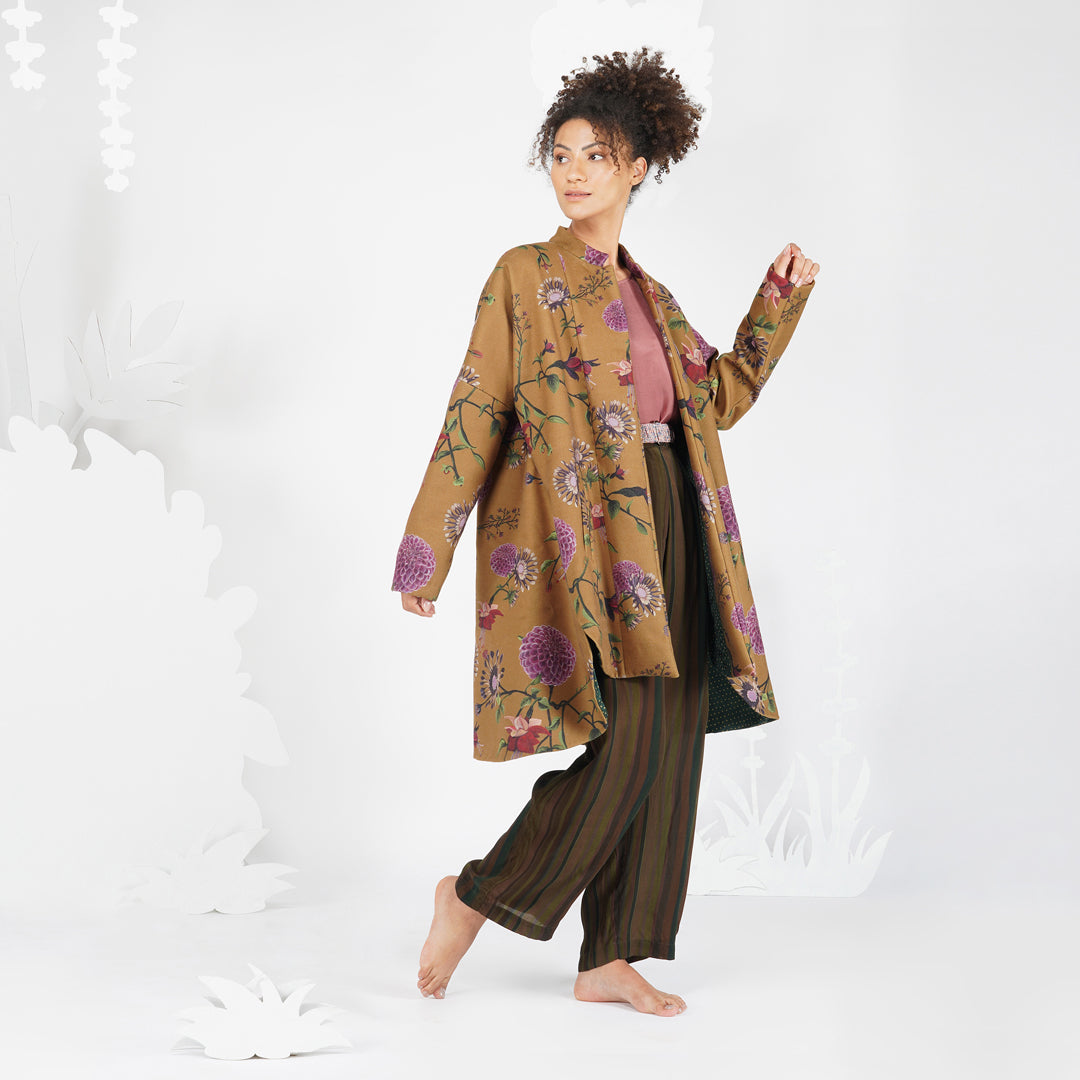 Paying homage to the natural colours found in nature, these oil painted florals on a deep tan, in a high low cut embody the spirit of romance and harmony. The mandarin collar with a center open flap makes it a versatile jacket that can be worn in multiple ways.