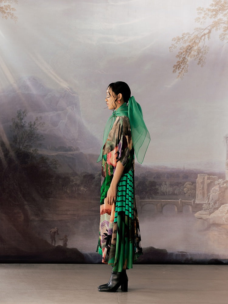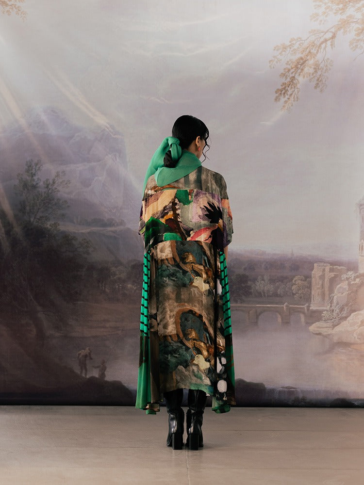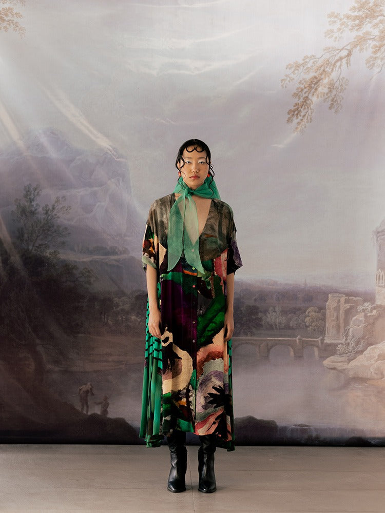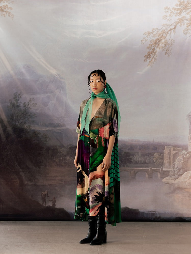 Engineered Print Dress crafted in luxurious Cupro, inspired by our AI Art Story. This dress features an open front design with gathers at the waist, creating a flattering silhouette.