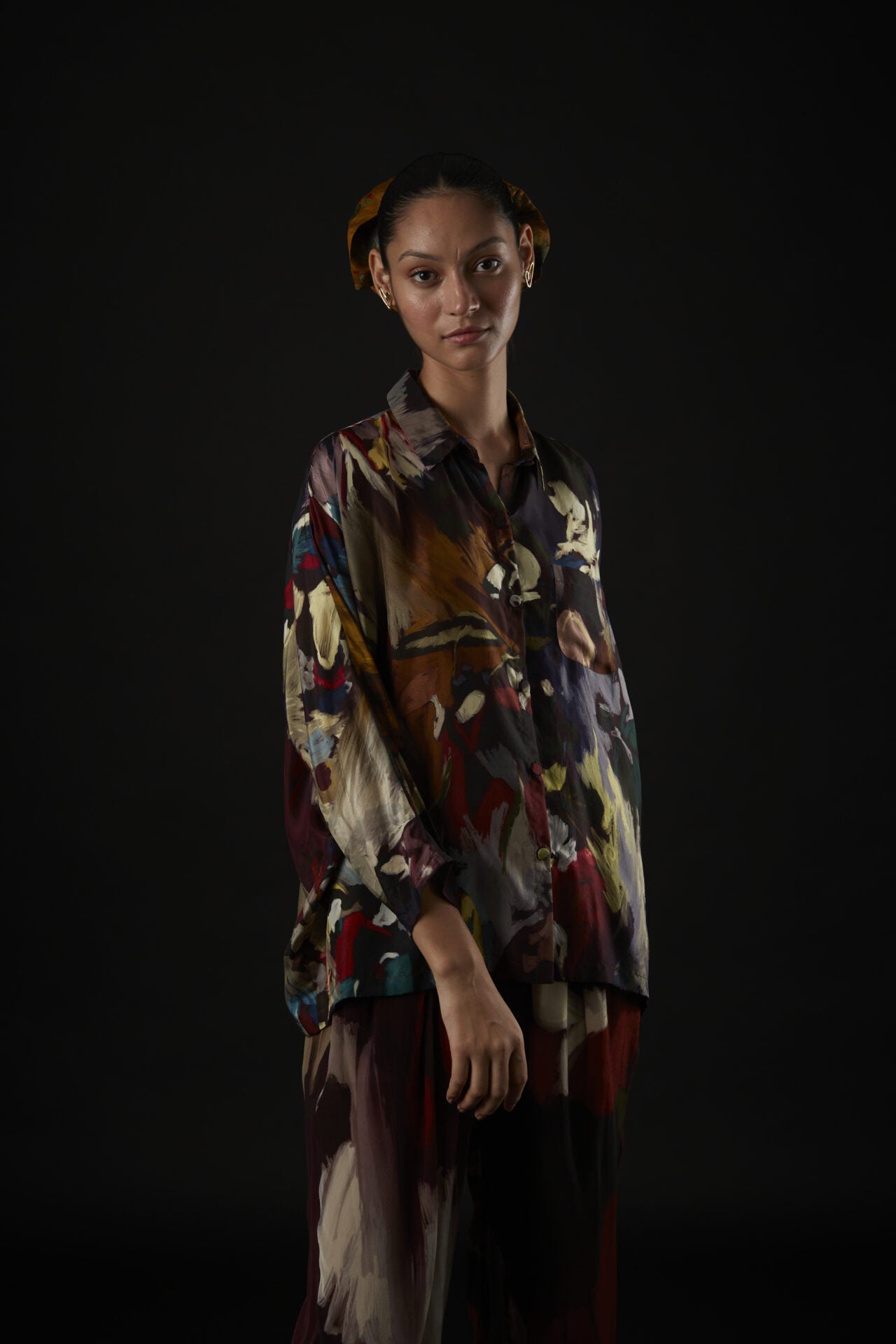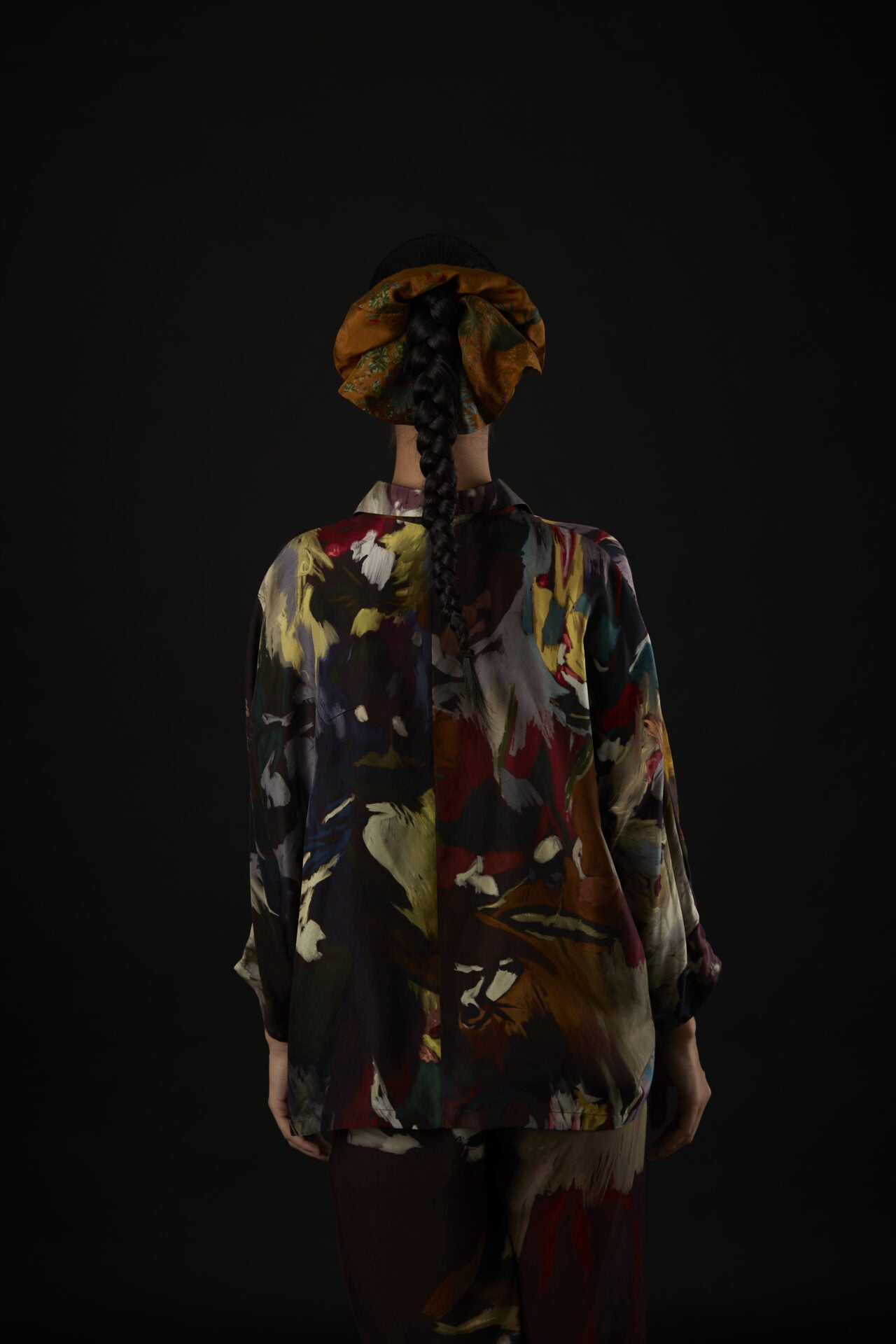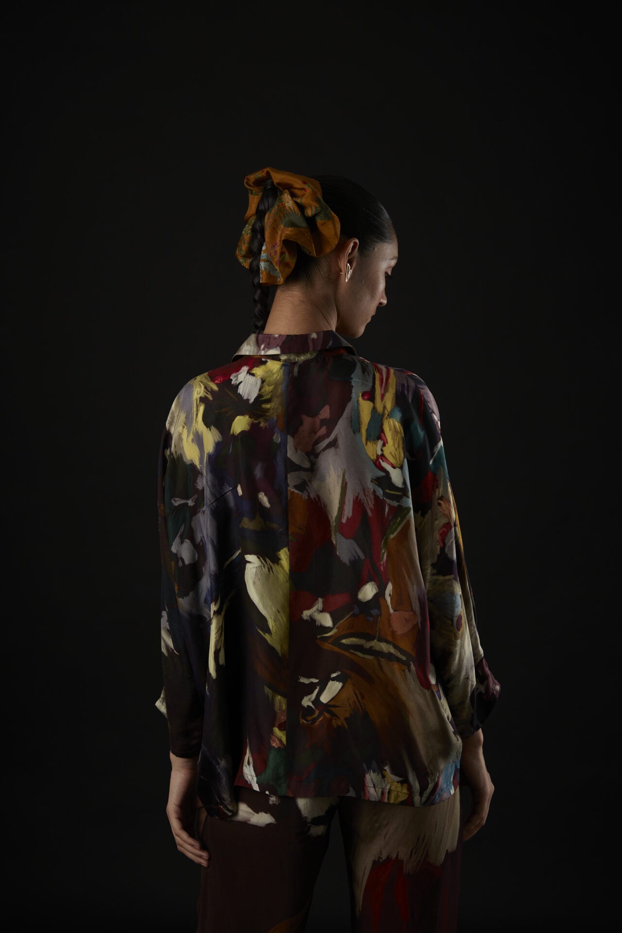 The assortment of picturesque strokes are etched onto a shirt with relaxed shoulders, cuffed sleeves, and handmade fabric buttons lining the shirt’s placket.