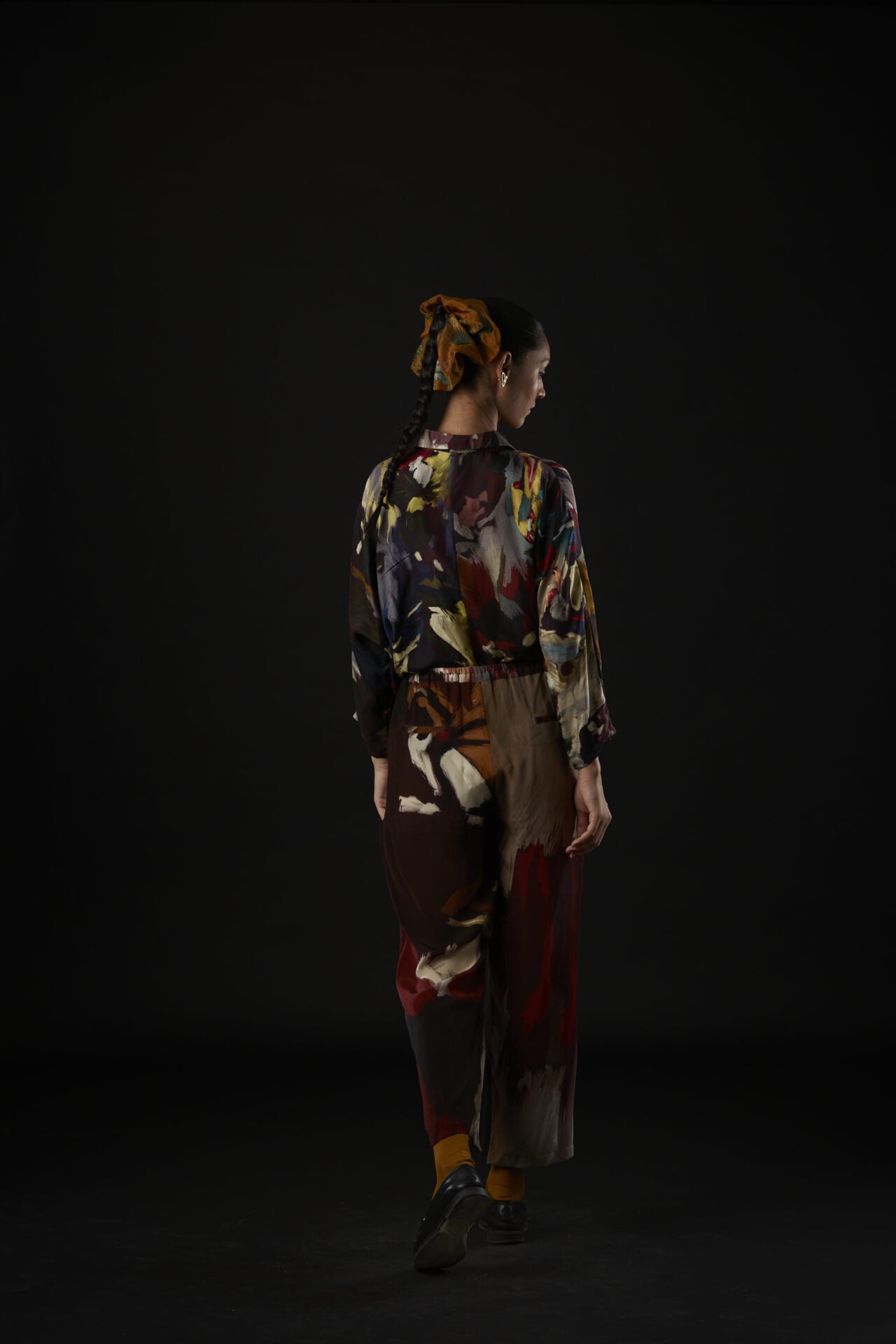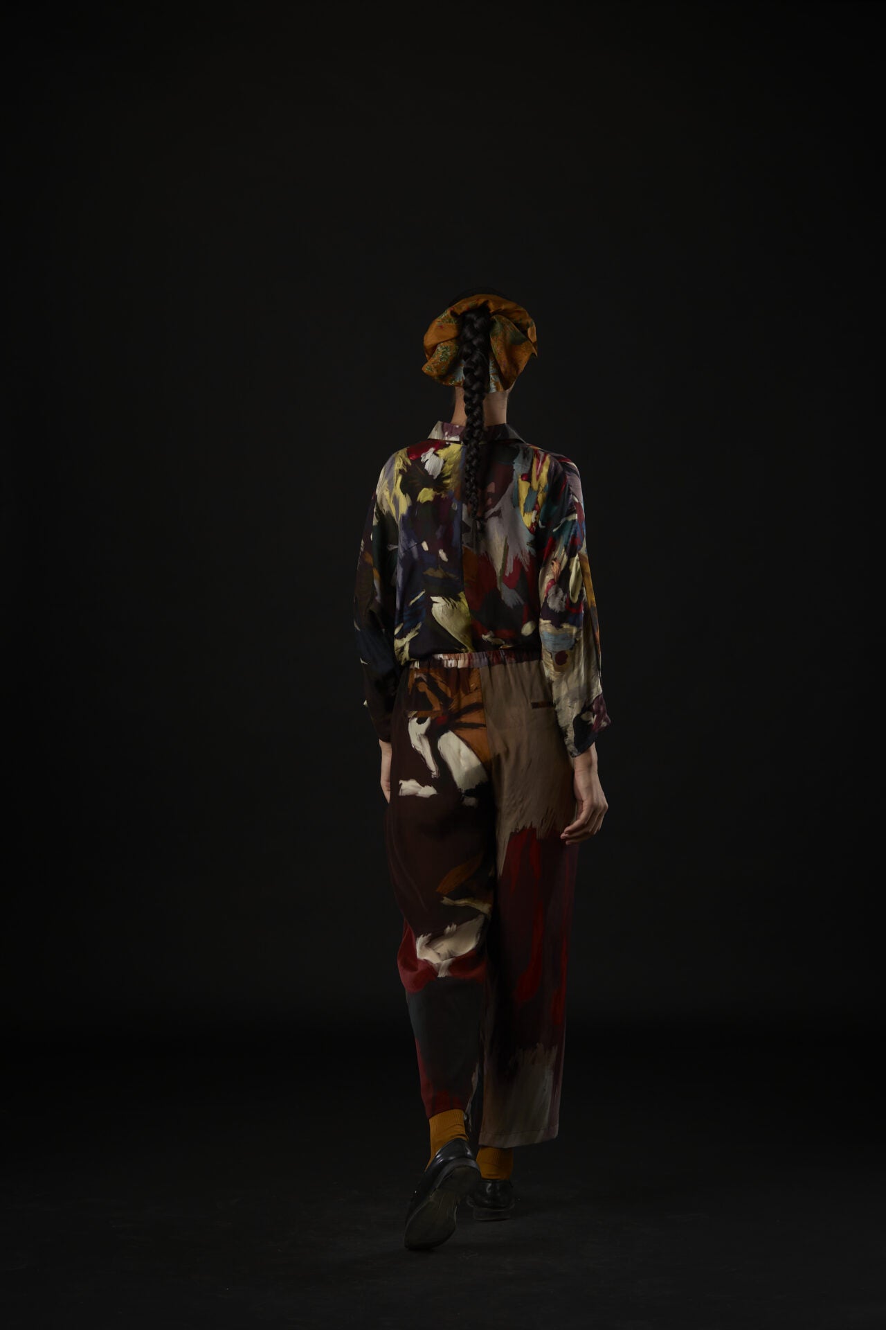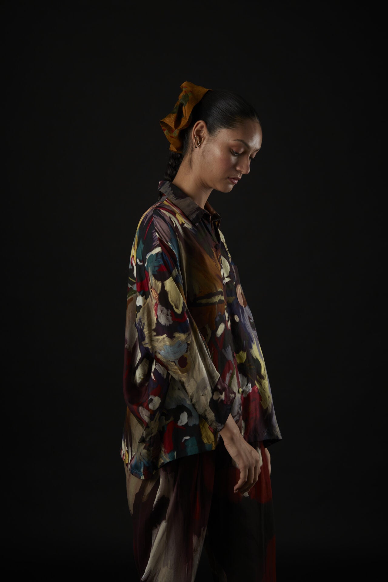 The assortment of picturesque strokes are etched onto a shirt with relaxed shoulders, cuffed sleeves, and handmade fabric buttons lining the shirt’s placket.