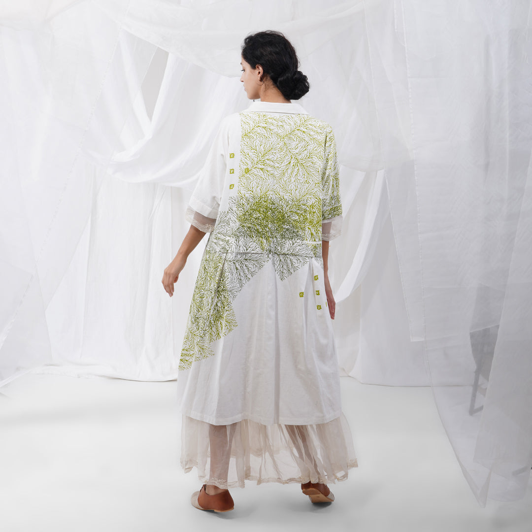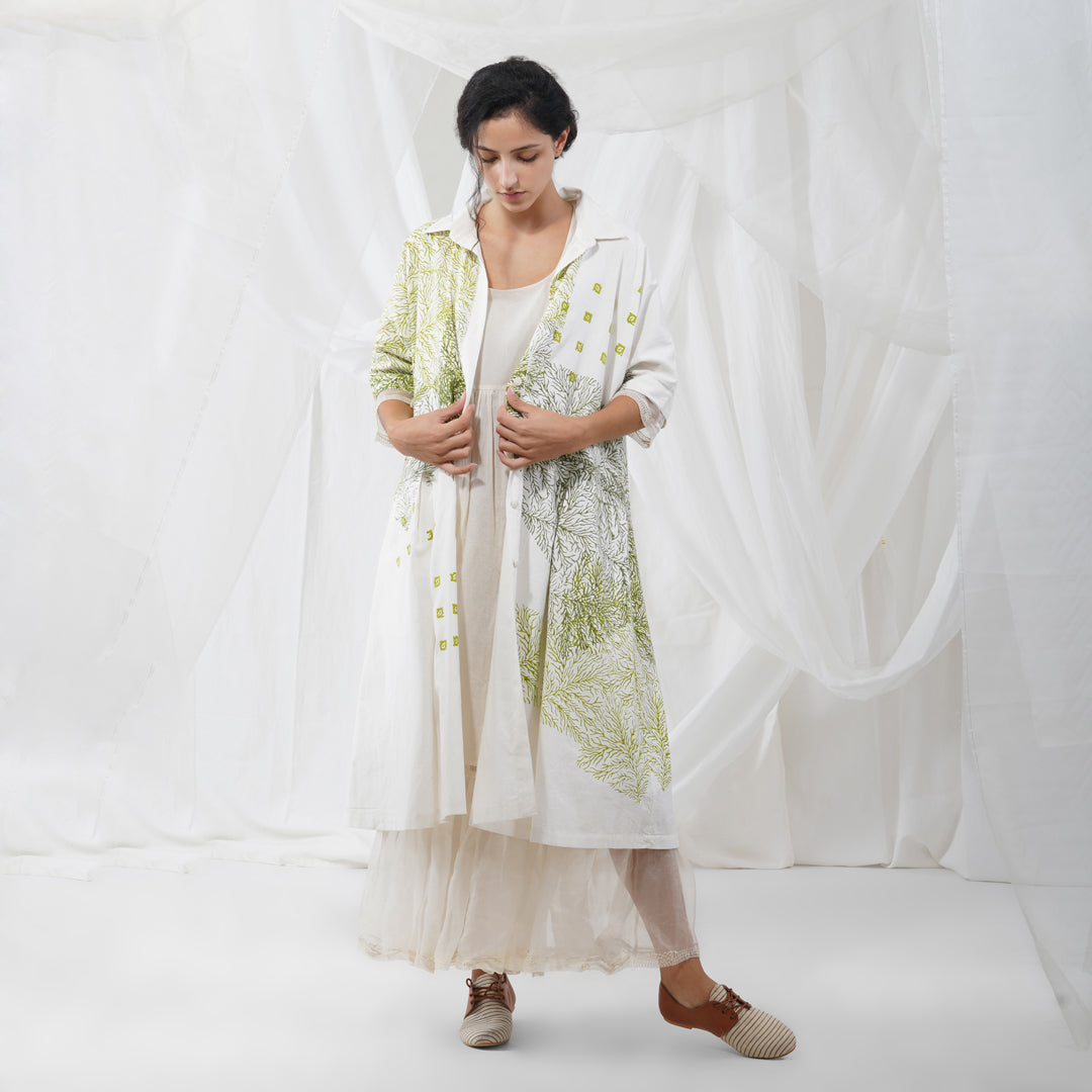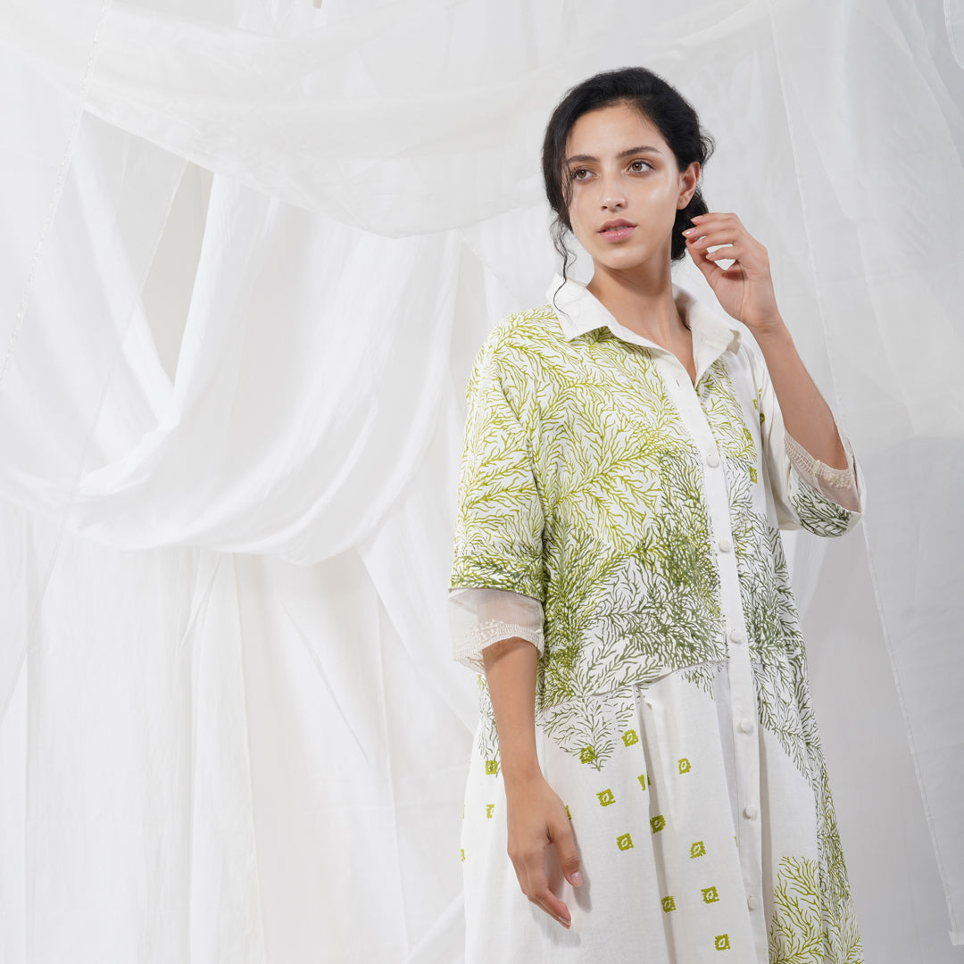 Short button down khadi dress with pockets. Hand block-printed with fluorescent pigments, Neo is the perfect dress or overlay for summer- alive with the spirit of spring.