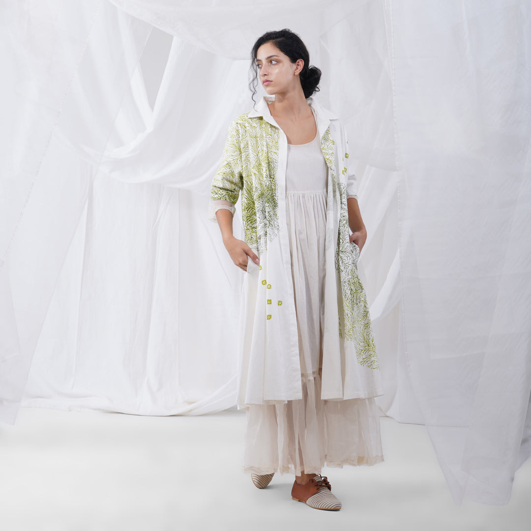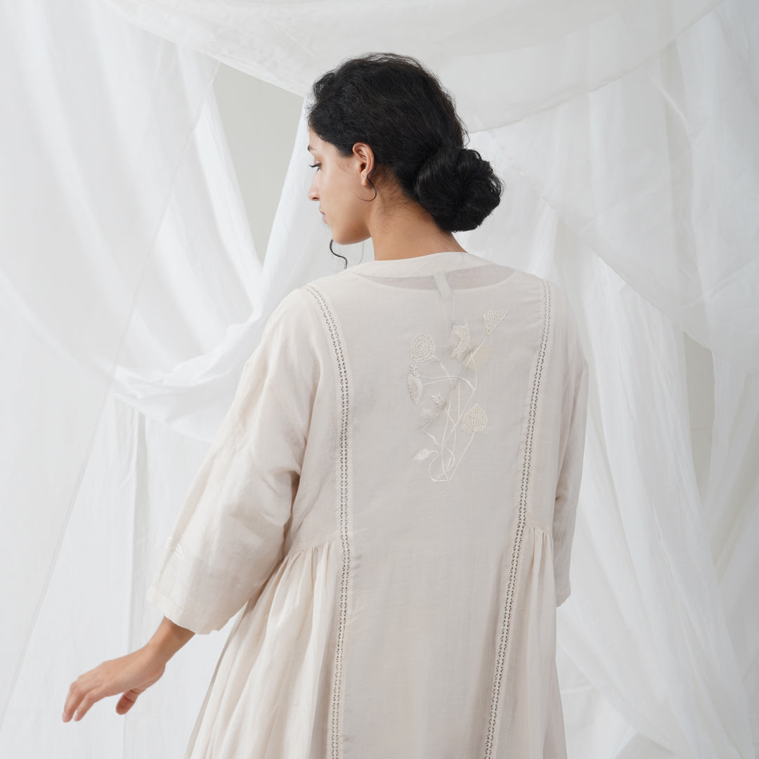 Long, side-gathered chanderi angrakha dress in ivory with delicate hand embroidered and lace details. The ethereal Pakiza Angrakha was born to be paired with the Pakiza Slip Dress, but can be paired with solid pants or a printed slip as a statement.