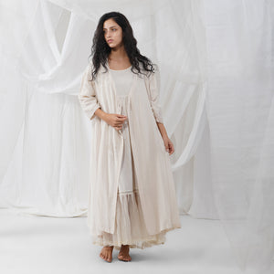 The Pakiza long gathered cotton dress in ivory is detailed with organza panelling and intricate hand embroidery on the sleeves and hem. Subtle and versatile, the Pakiza slip dress was designed to be styled under our angrakha styles this season, but also stands beautifully by itself or paired with a printed Yavi scarf.