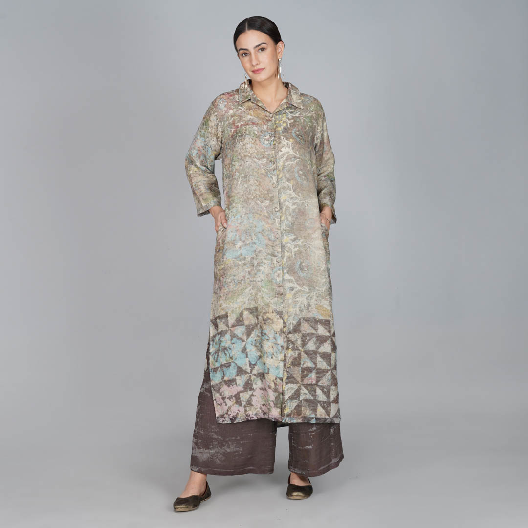 Impressionist brush strokes , caresses sheer handwoven Cotton zari fabric .This short dress with collar and buttons at front can be opened and also be worn like an over garment making it a Festive wardrobe essential.