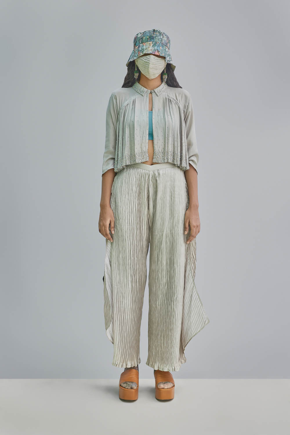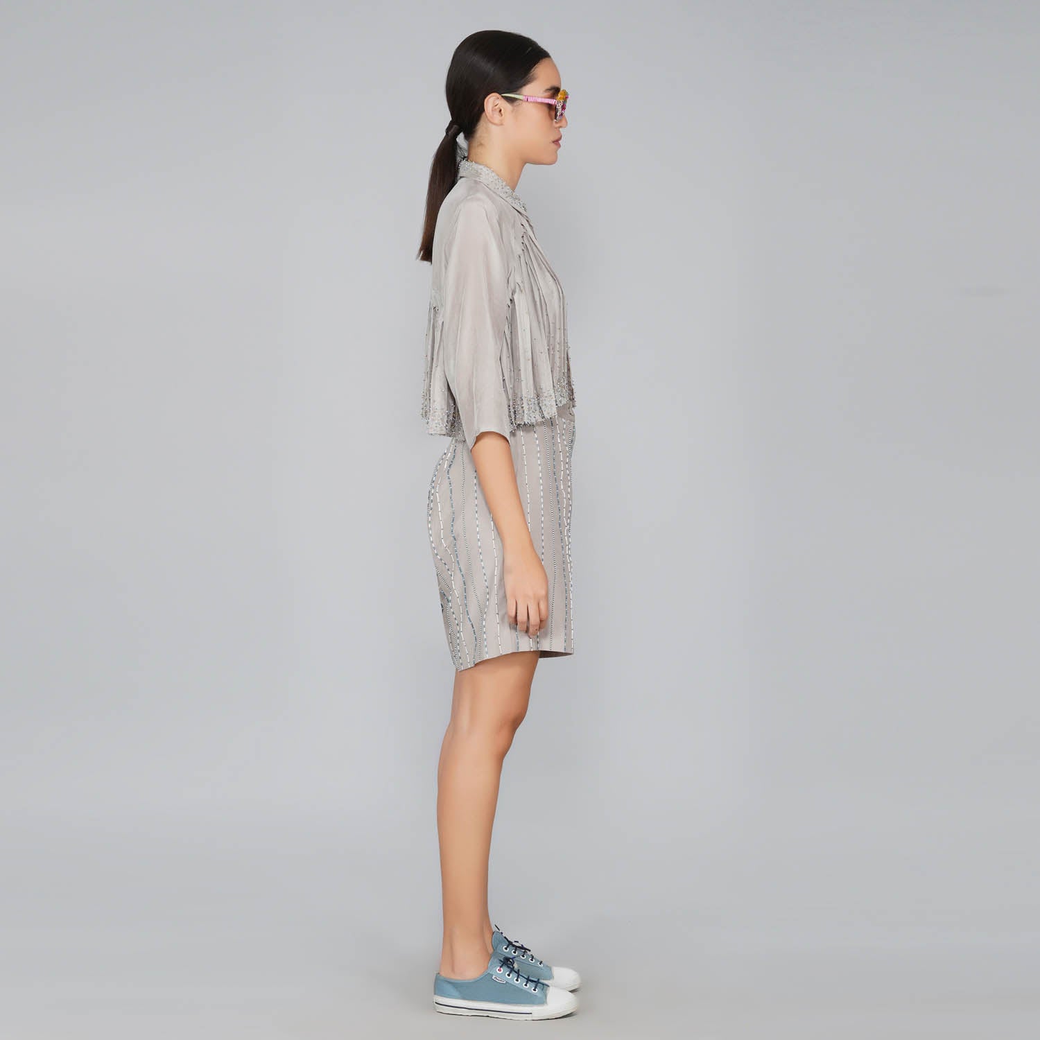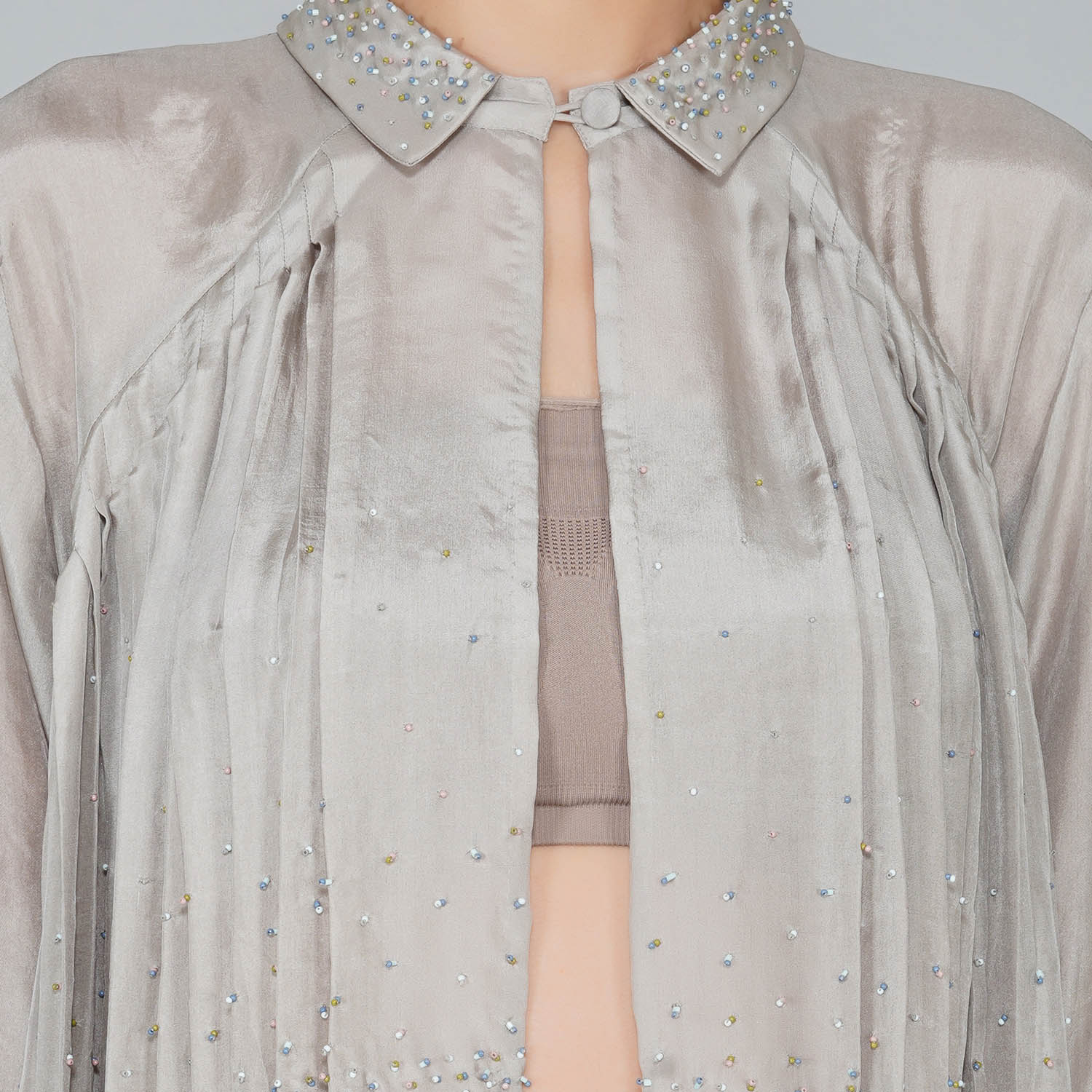 - Pleated silk short shrug with sprinkle beaded details at hem and collar