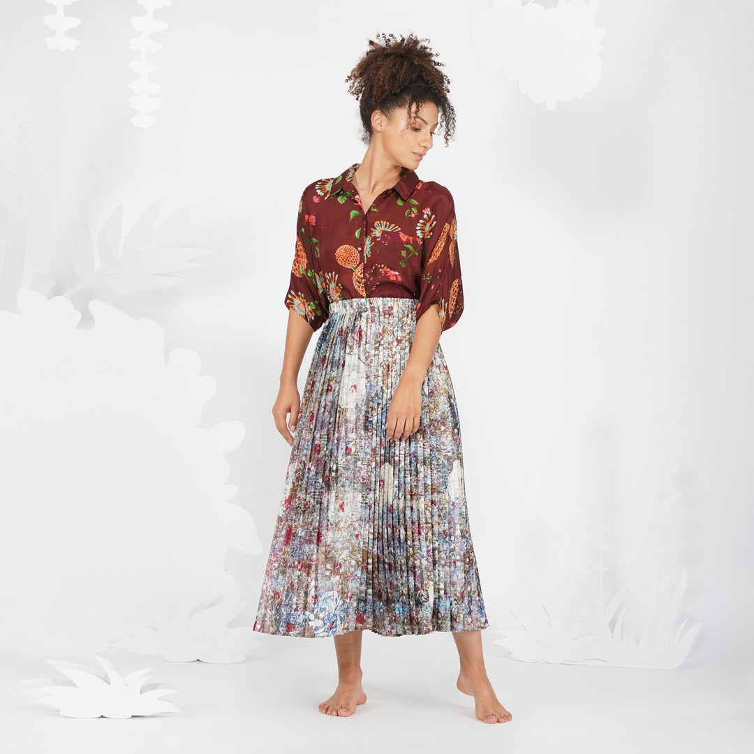 - Floral printed collared button down silk shirt.