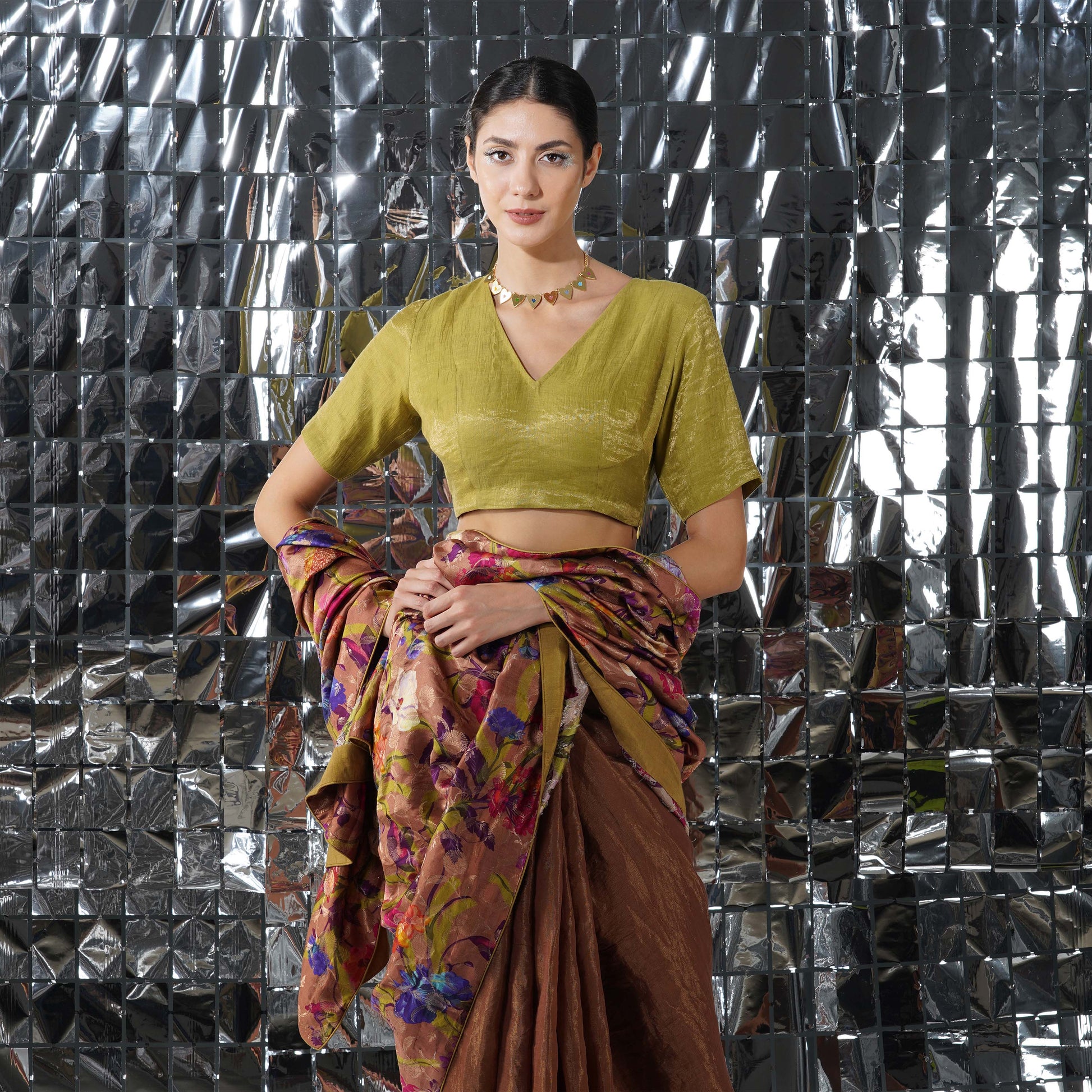 The gold cotton tissue blouse is a perfect festive wardrobe staple. The silhouette is comfortable and chic. And pairs well with the half and half saree.