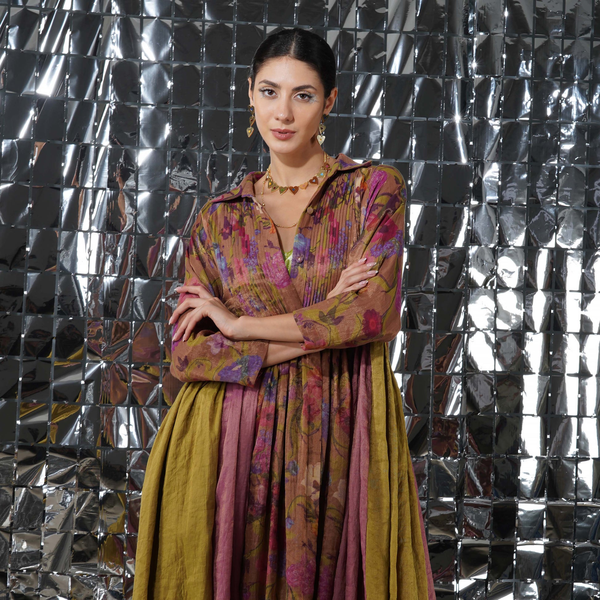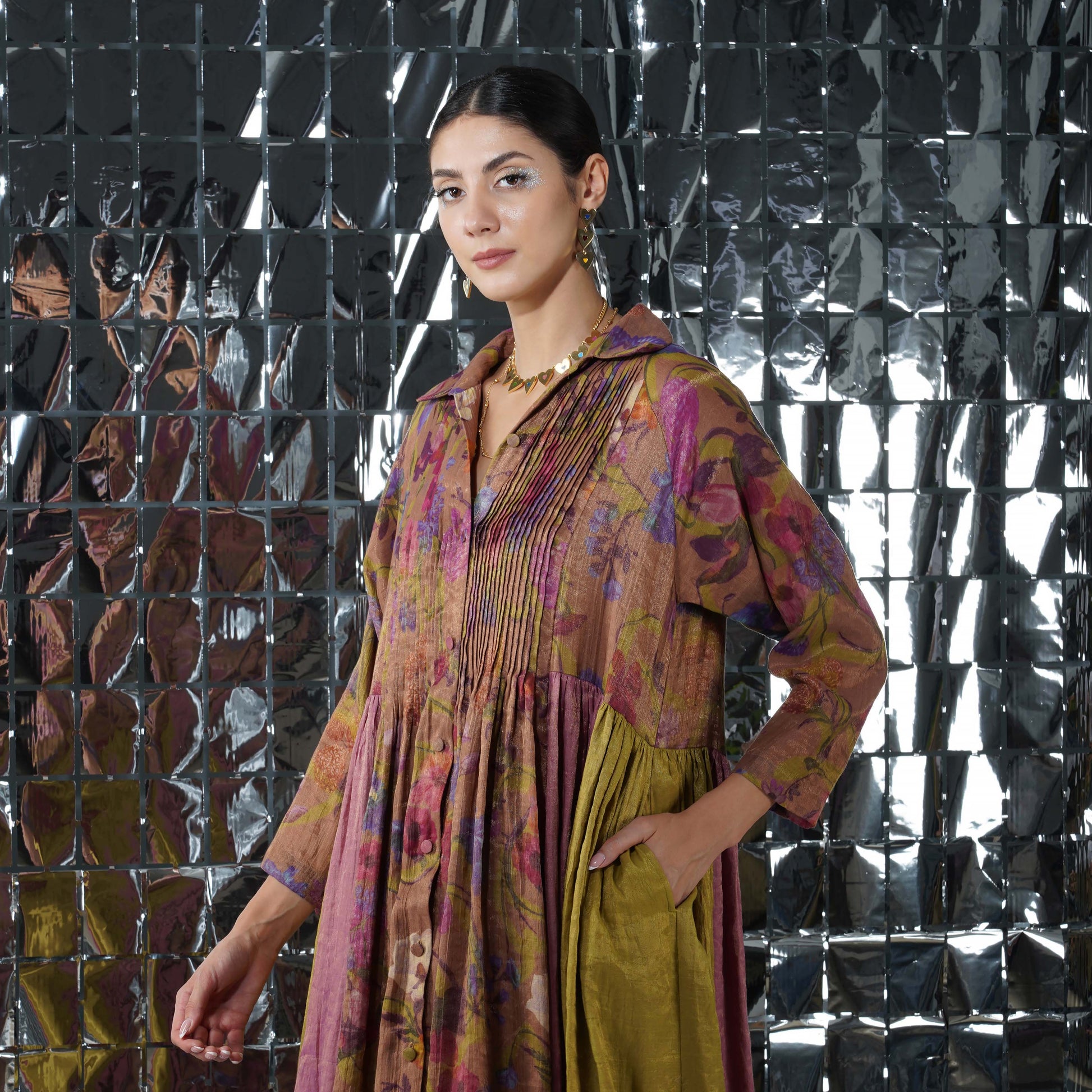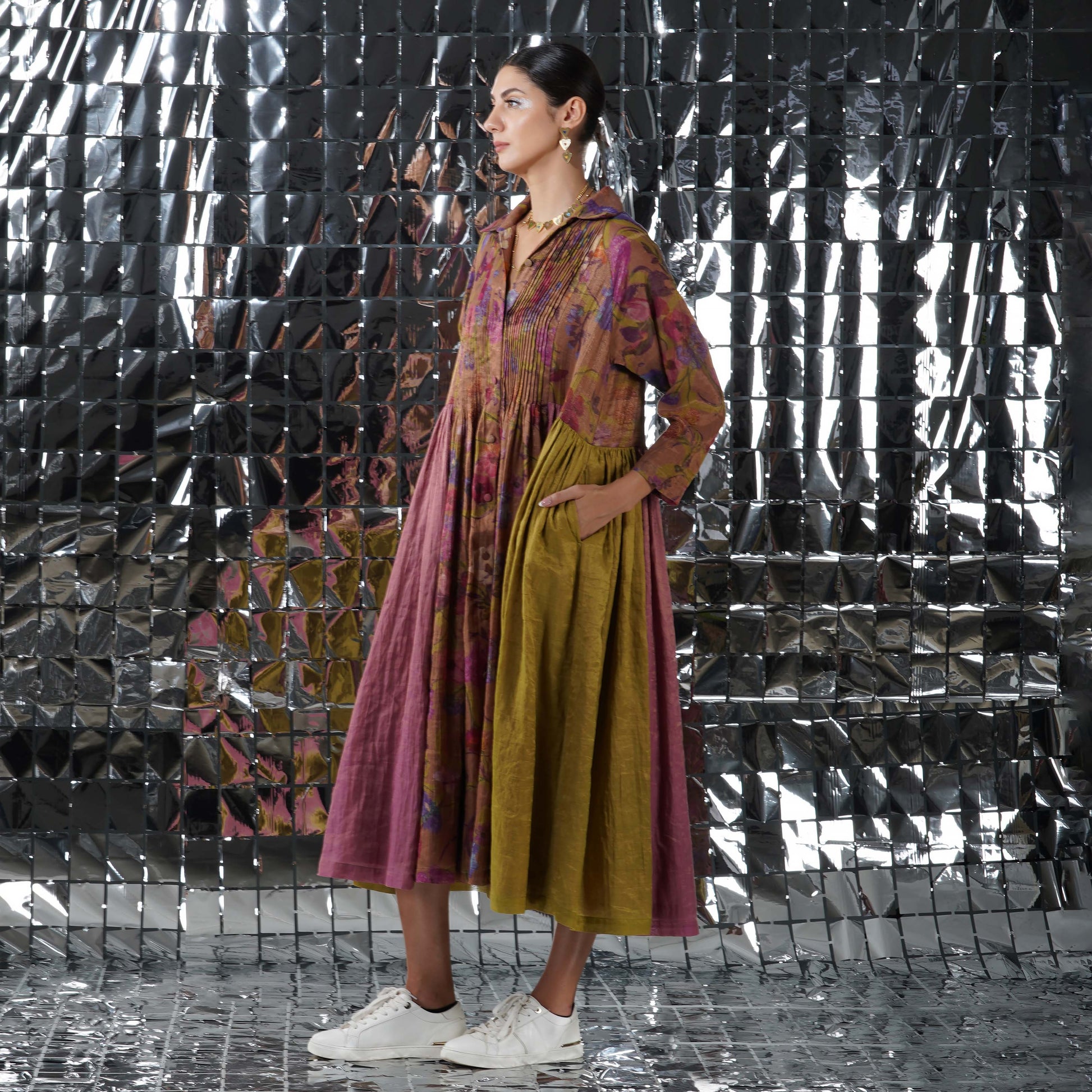 Yavi’s contemporary take on florals. This urbane dress with contrast fabric features delicate pintucks and waist gathering.