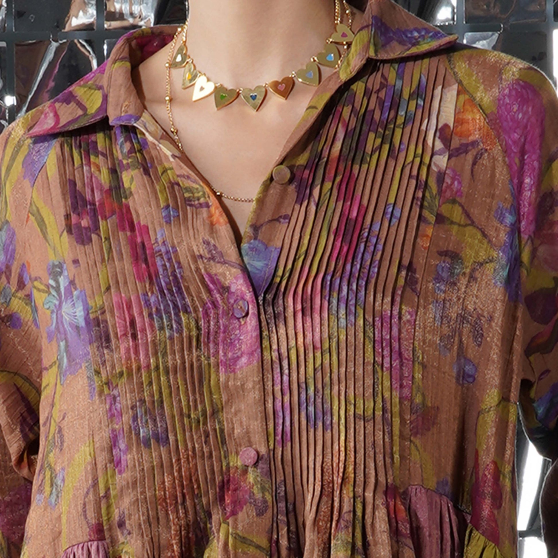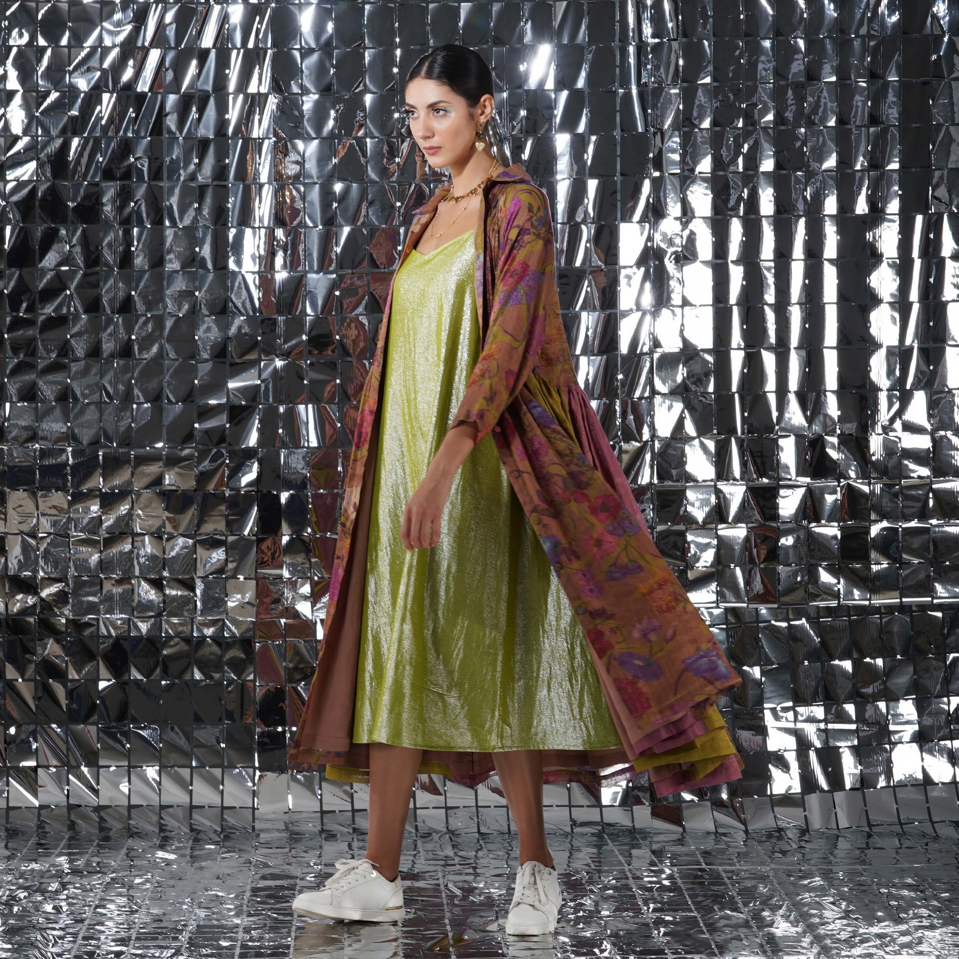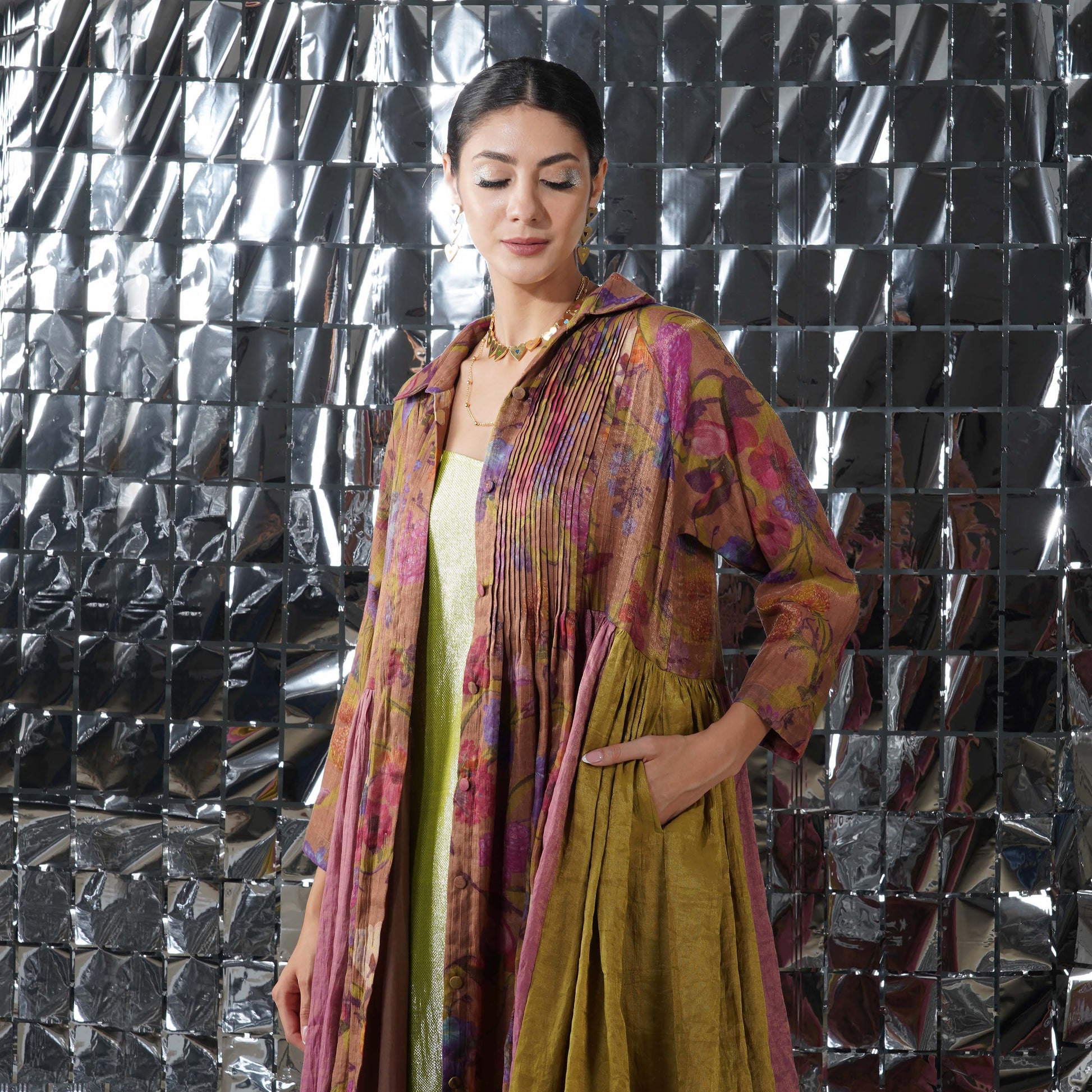 Yavi’s contemporary take on florals. This urbane dress with contrast fabric features delicate pintucks and waist gathering.