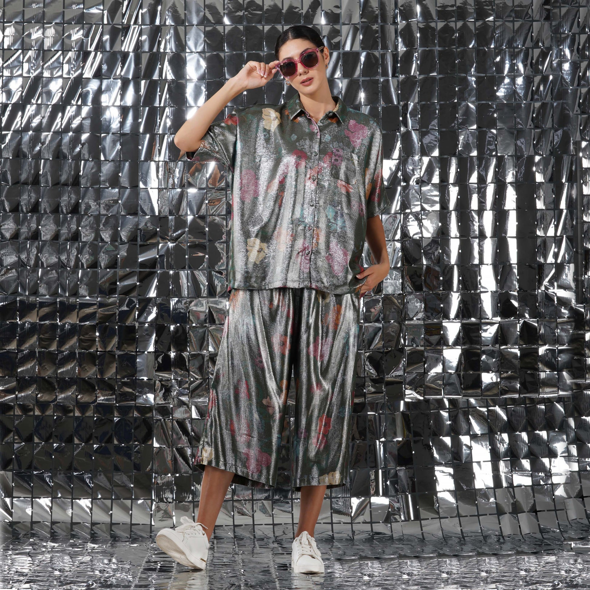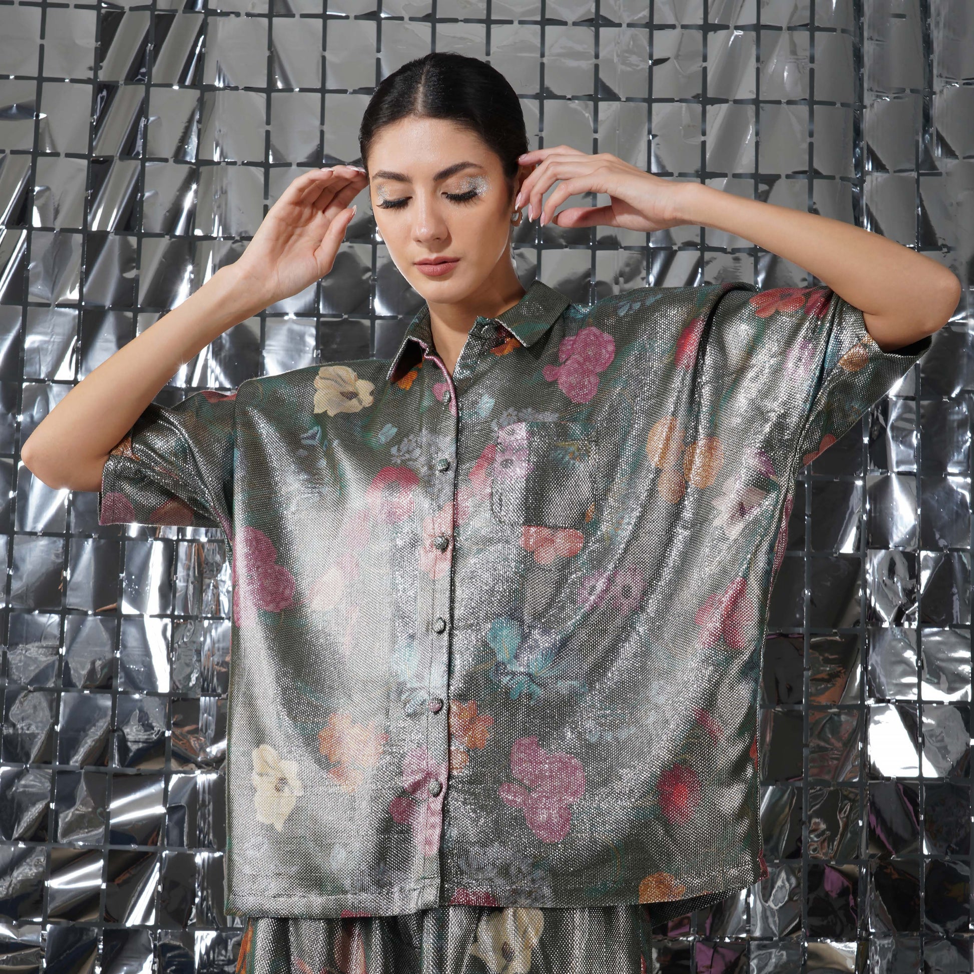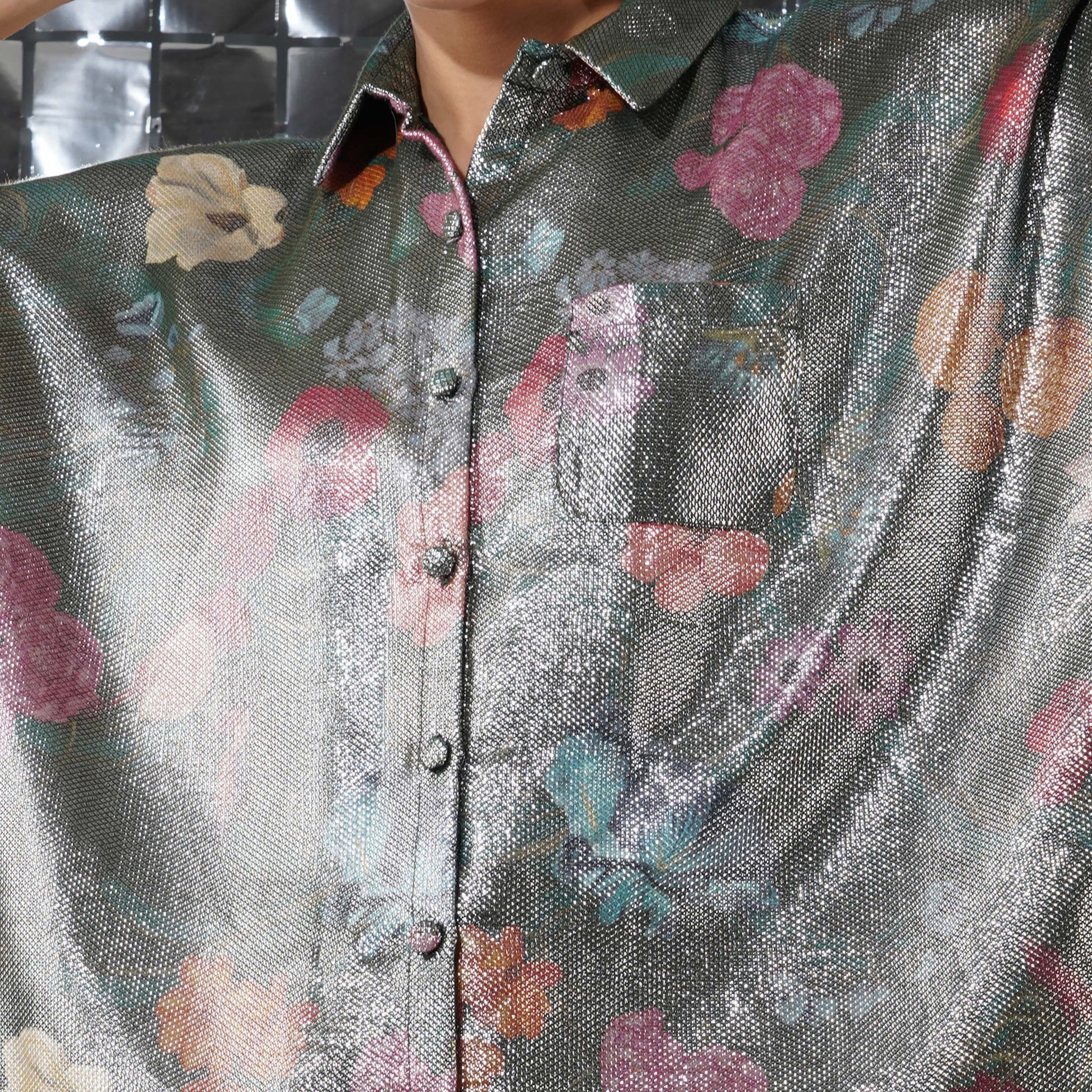Experience a swanky take on silhouettes, with an emphasis on comfort. Elevate this versatile shirt by blending the beauty of elegant florals with alluring glitter.