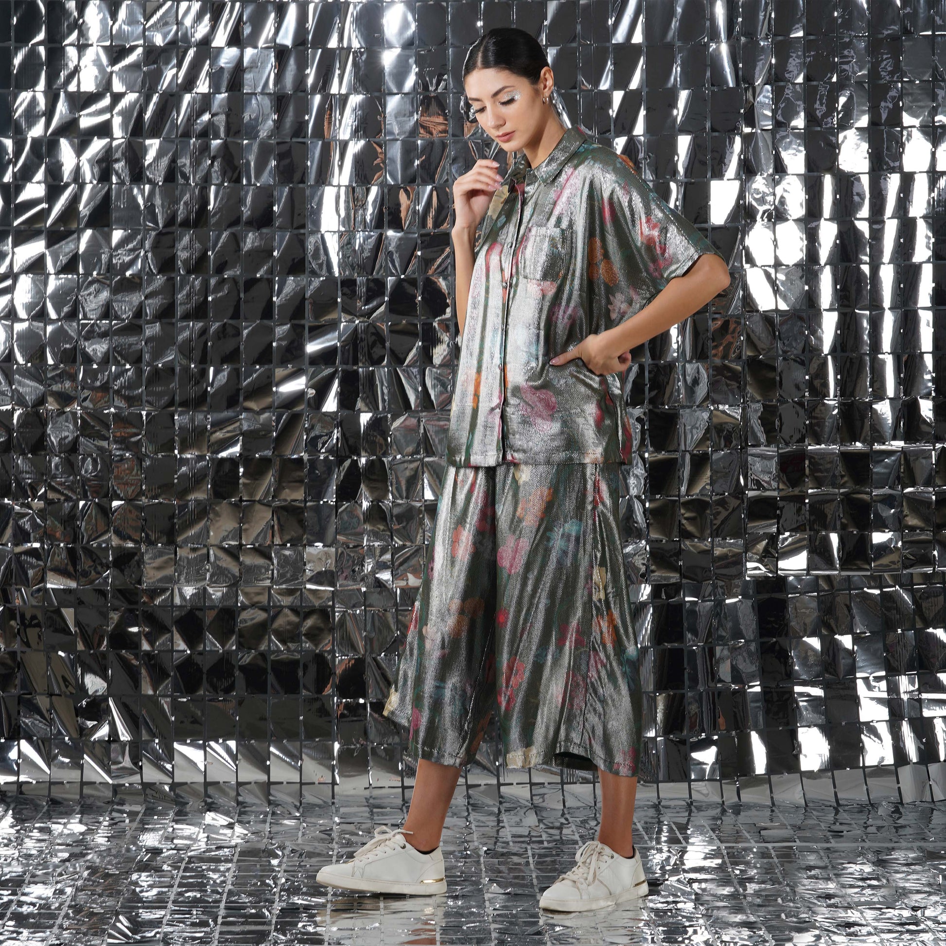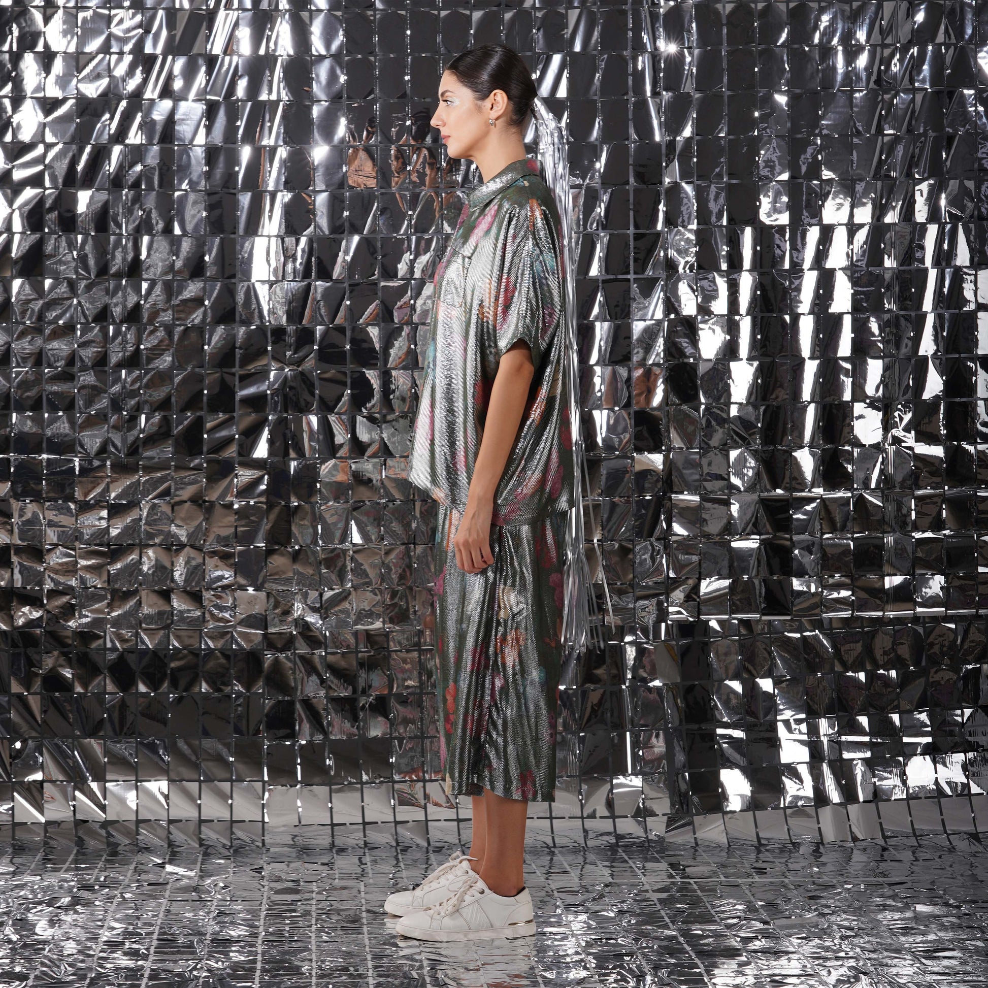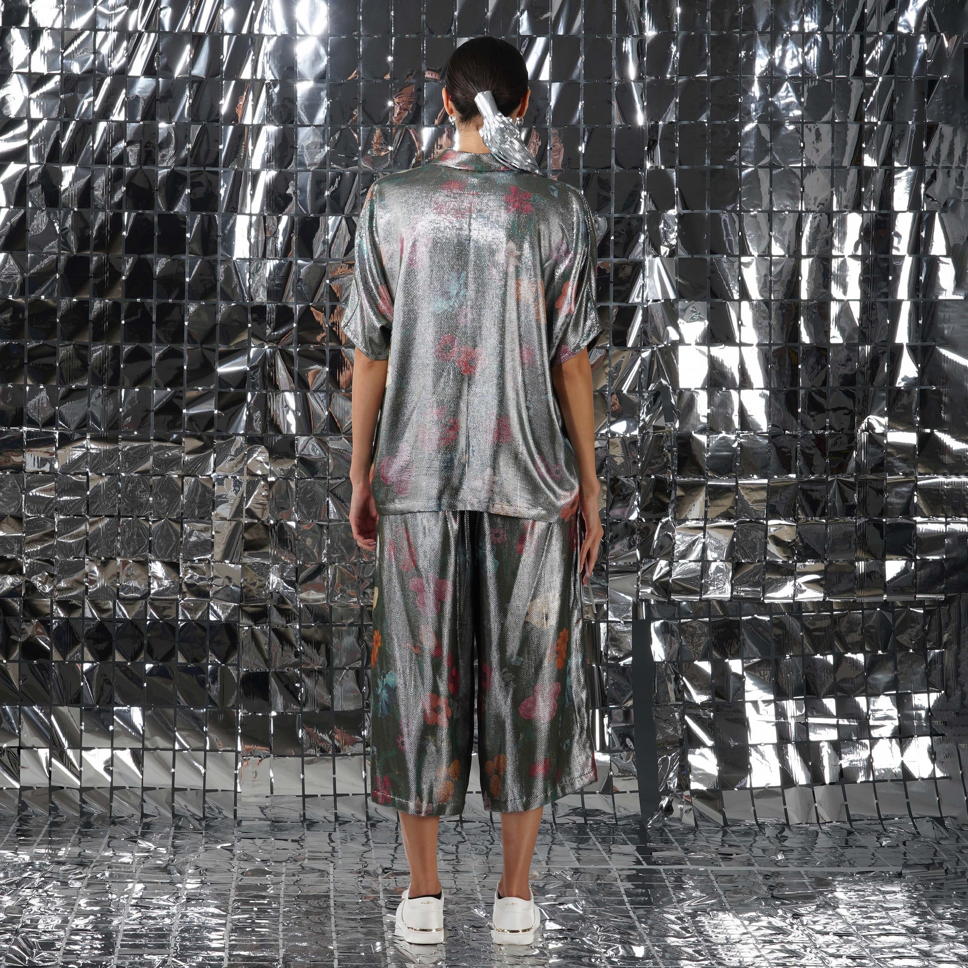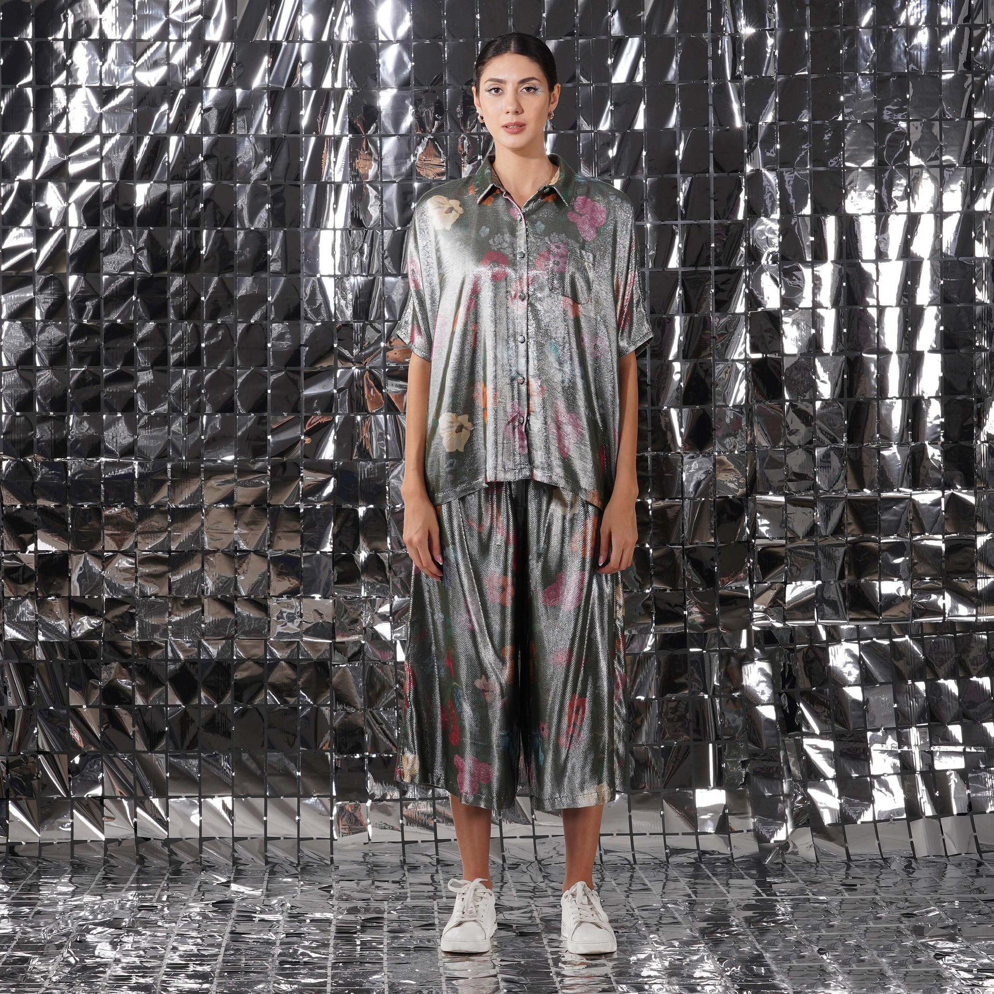 Experience a swanky take on silhouettes, with an emphasis on comfort. Elevate this versatile shirt by blending the beauty of elegant florals with alluring glitter.