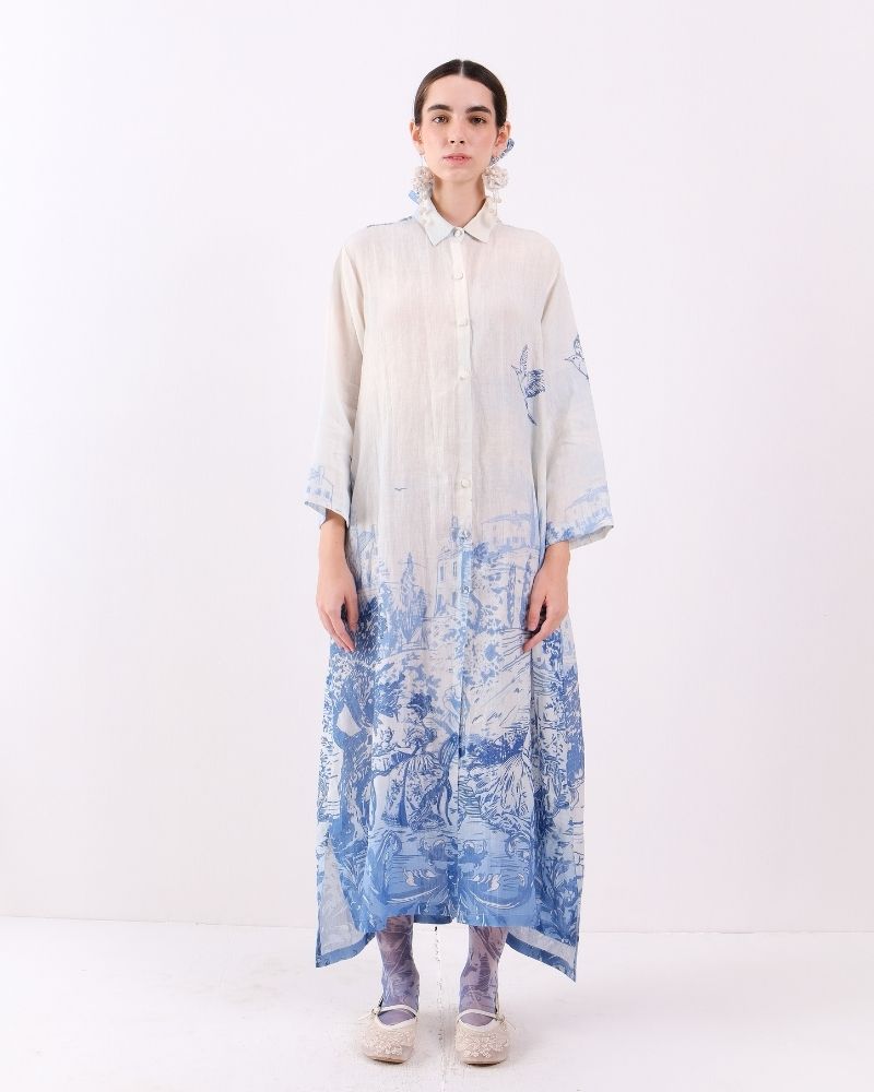 Toile de jouy button down collared shirt dress with in seam pockets in Linen.
