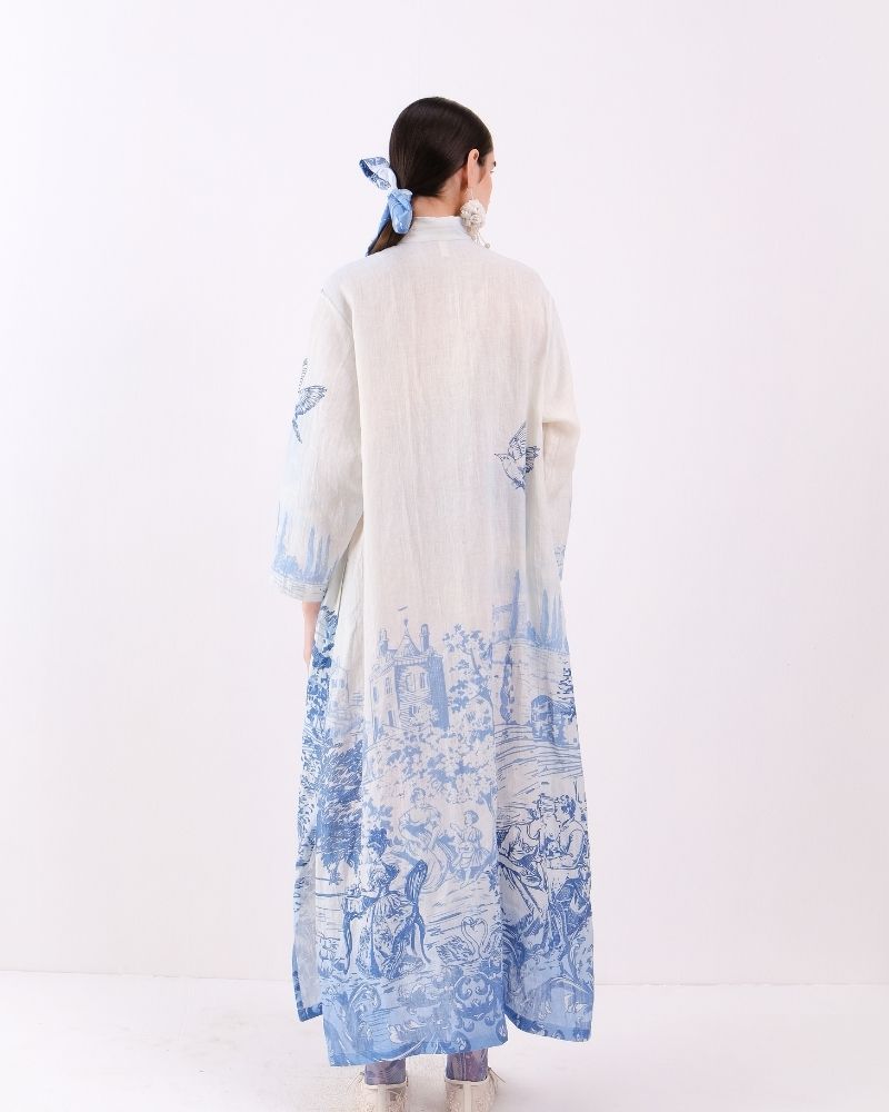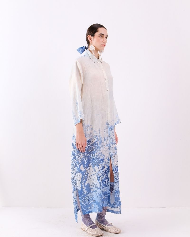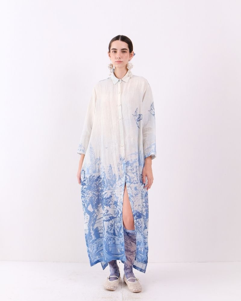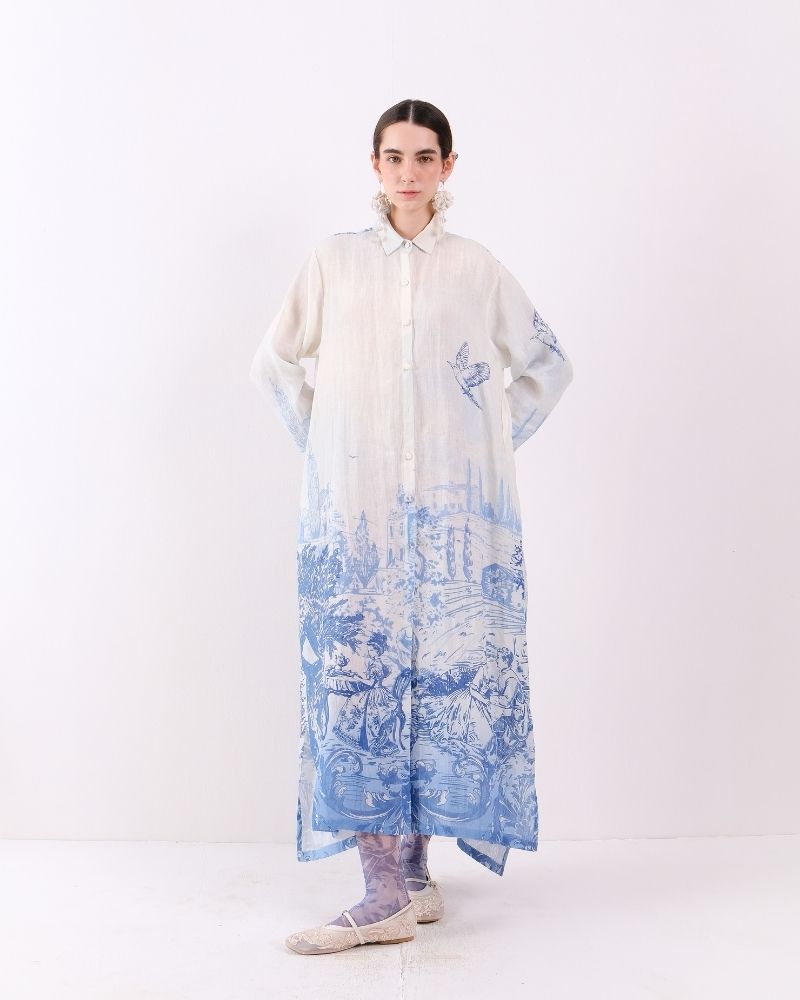 A breezy, relaxed shirt dress crafted from lightweight linen, featuring a classic collar, button-down front, and discreet in-seam pockets for practicality. The timeless Toile de Jouy print adds a touch of artisanal elegance, making it perfect for effortless, refined daytime styling. Dress is sold as a separate.