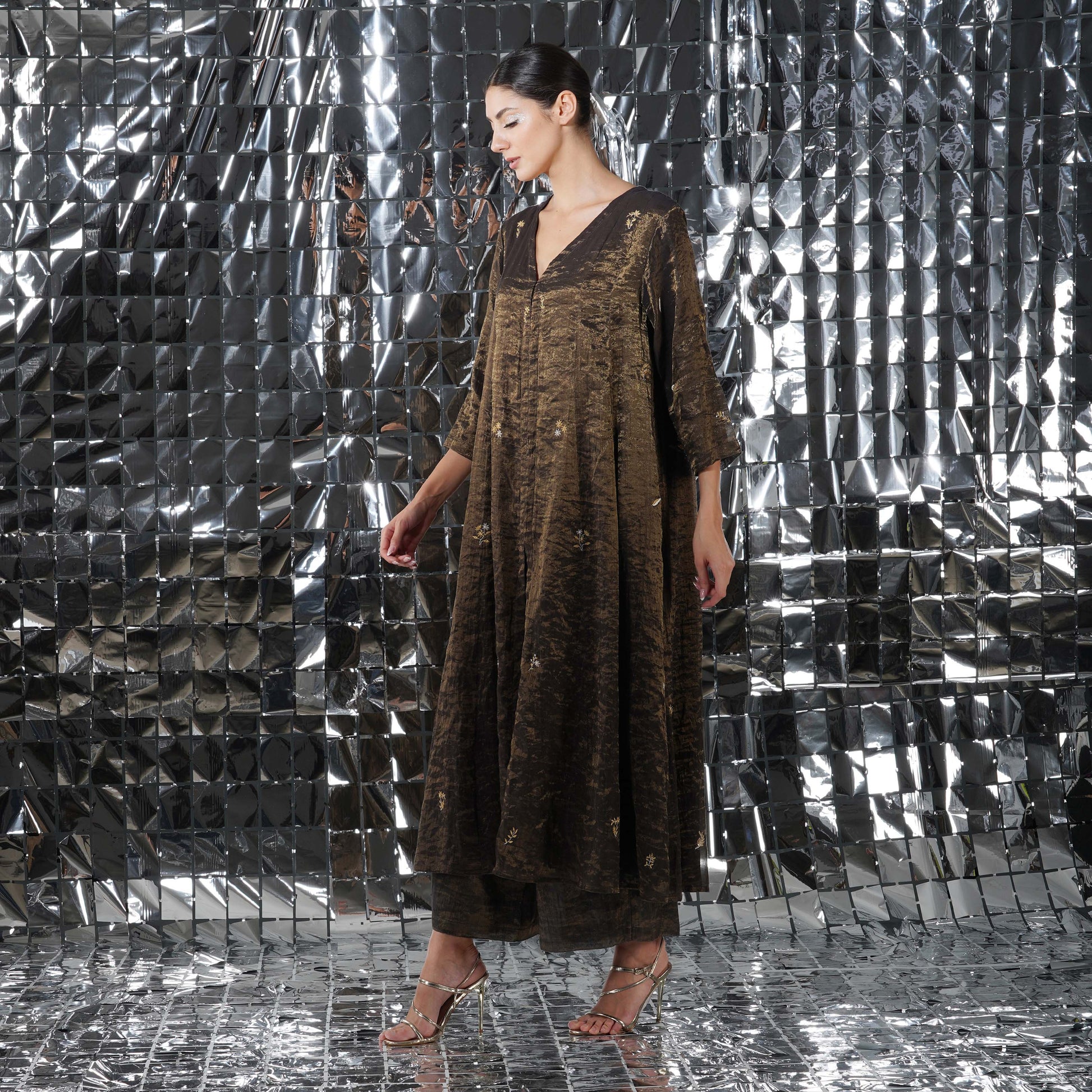 A curation of elegant party essentials and modern-festive pieces in rich textiles. The russet dress features meticulous hand embroidery on cotton silk tissue fabric giving it a luxurious and rich feel. An elegant and flattering a-line silhouette with a V-neck.