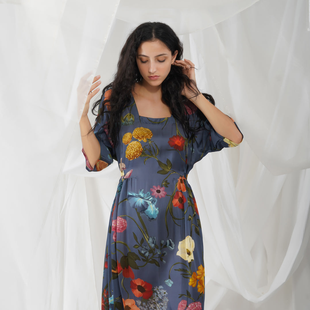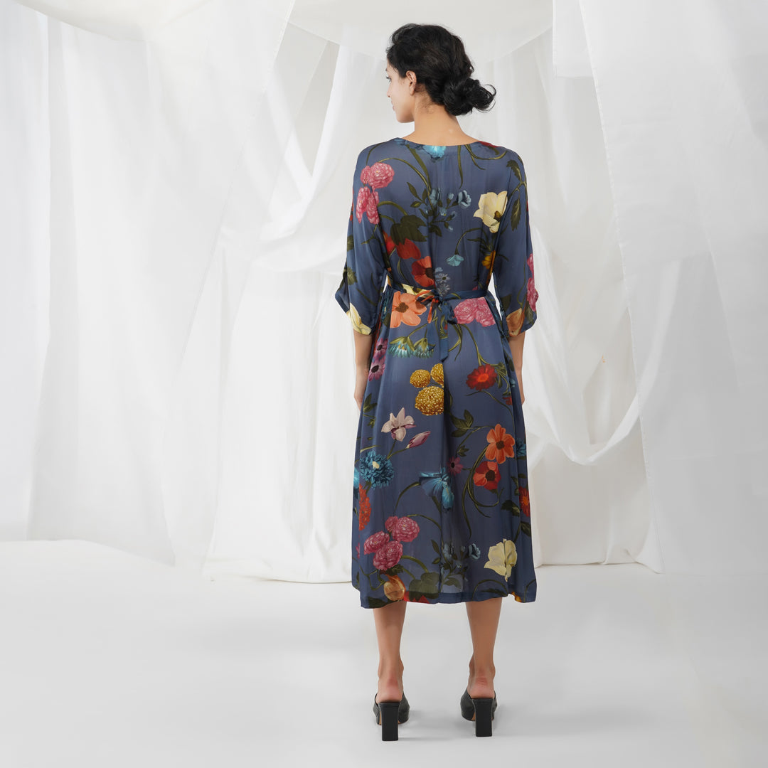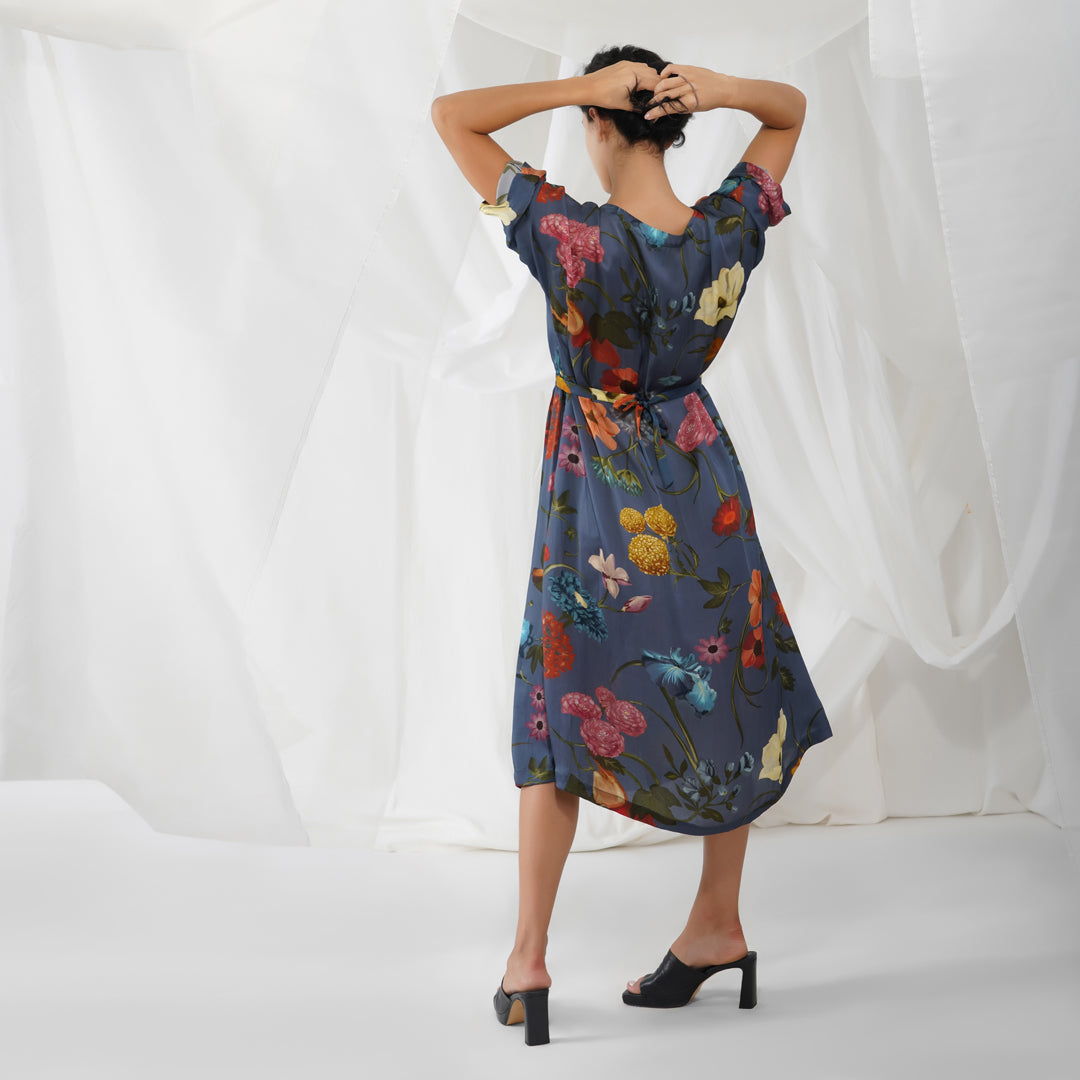 Blue floral printed dress with trapeze neckline and front/back tie detail.