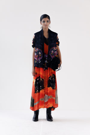 Printed lush orange kaftan dress. The hues from the food art story make the dress come alive.