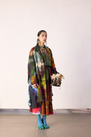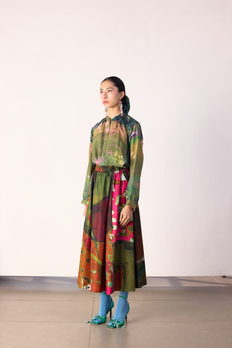 Enchanted woods mandarin collared button down shirt with cuffs and gather details in habutai viscose.