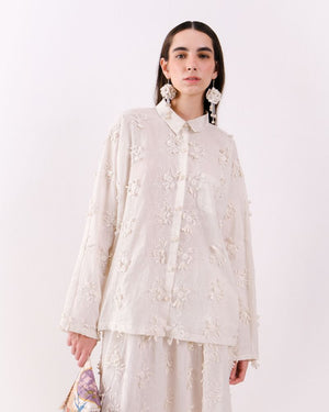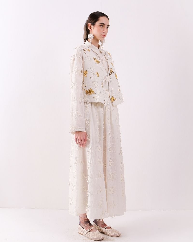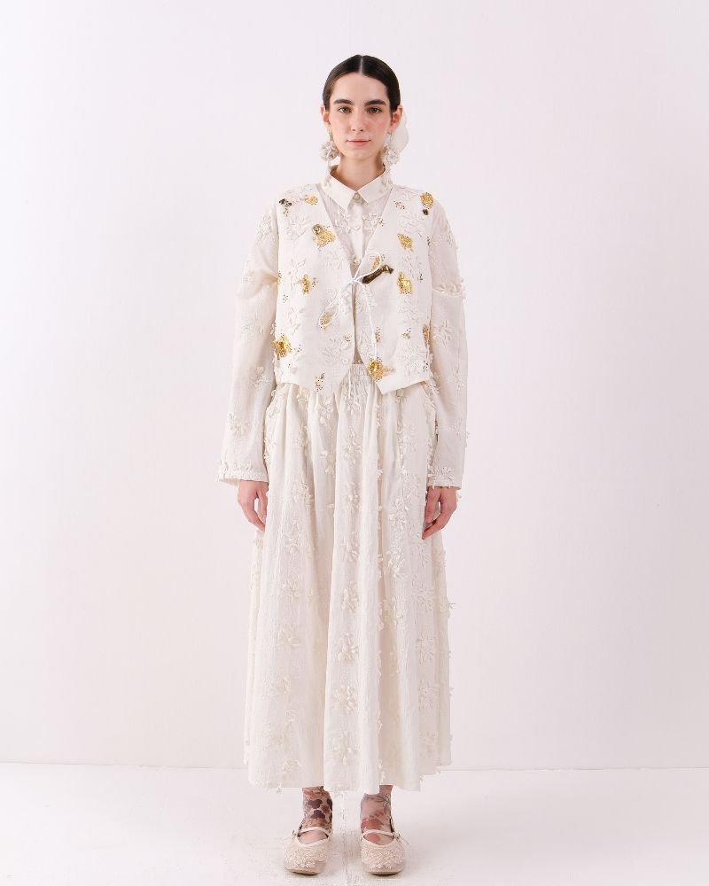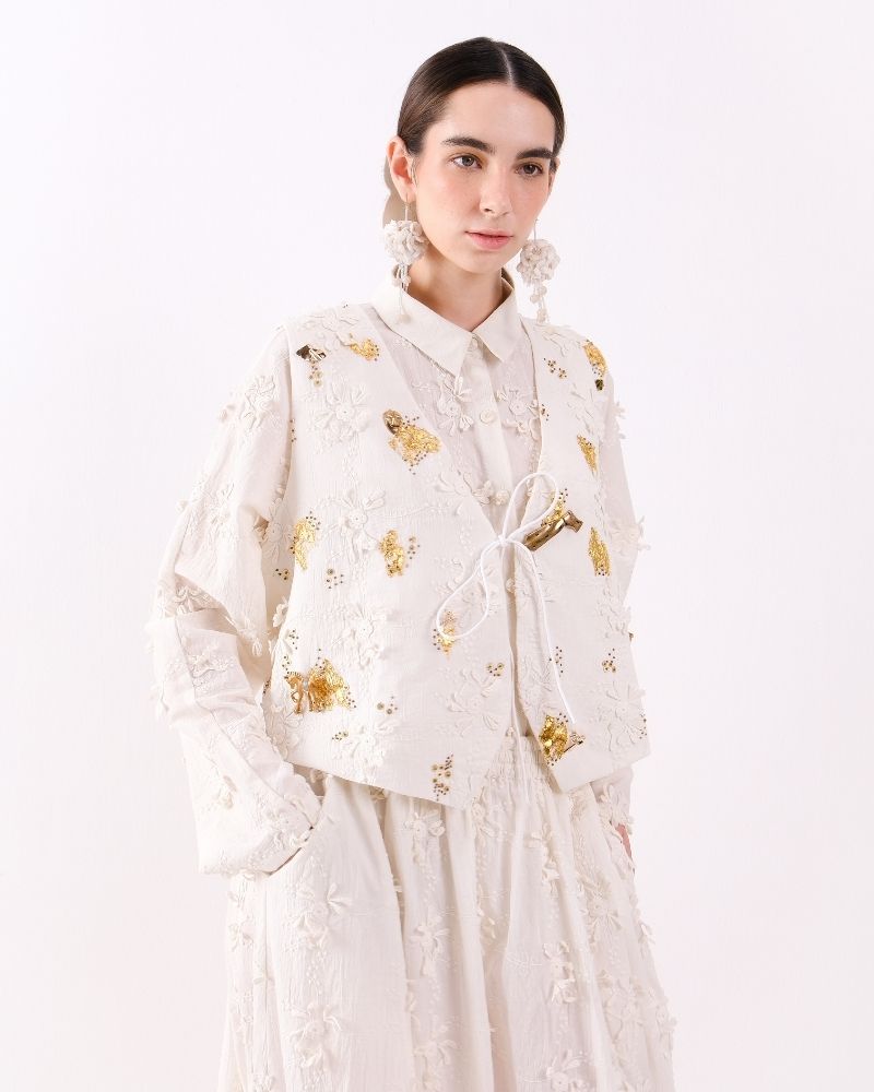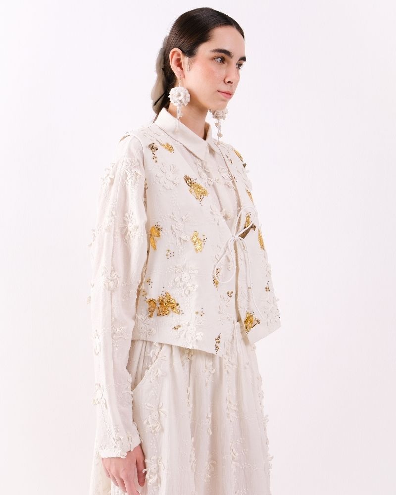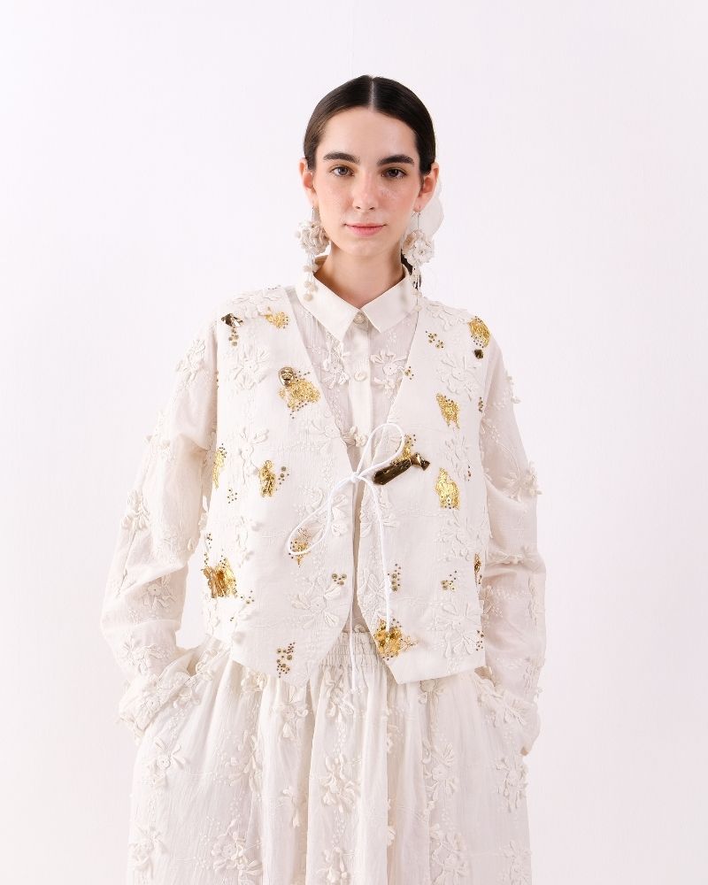 An elegant waistcoat crafted in soft cotton khadi, adorned with intricate floral lace motifs and subtle golden embellishments for a refined, artisanal touch. Structured yet lightweight, it adds a sophisticated layer to any outfit, blending traditional craftsmanship with contemporary style. Waist coat is sold as a separate.