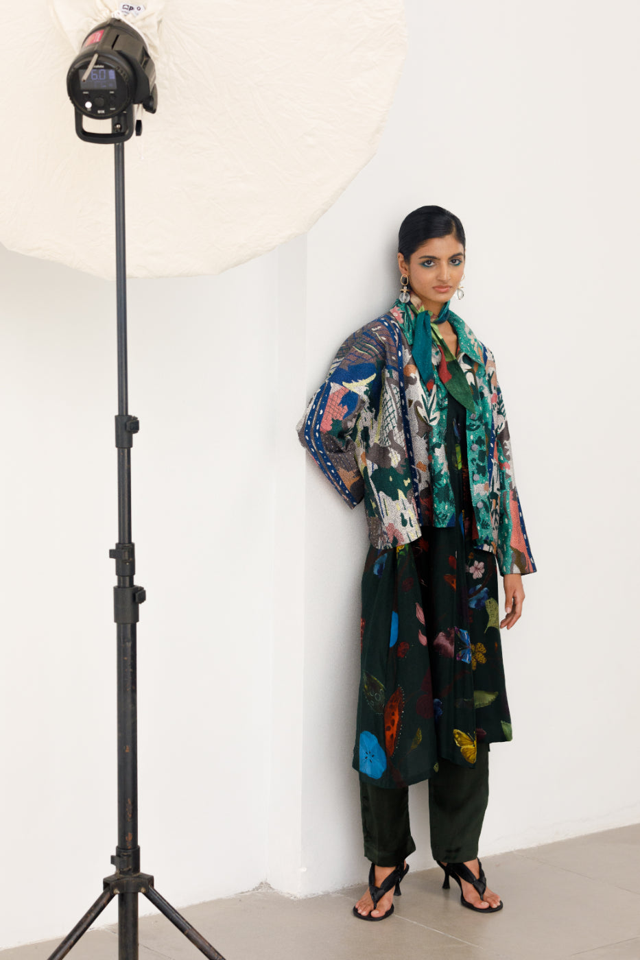 This timeless jacket takes over 30 days to embroider and has side pockets and a polka dot block printed lining on the inside.