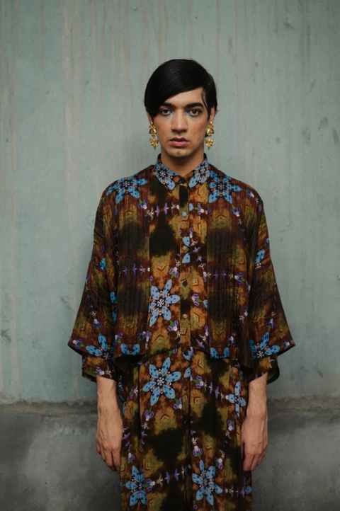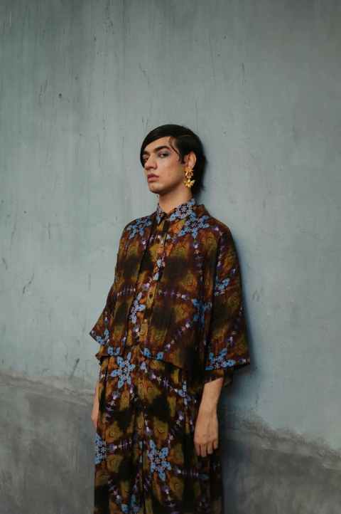 Chaos transforming into geometric patterns on a Yavi quilted jacket with lapel collar.