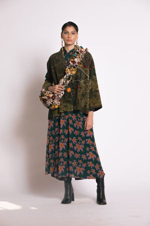 A-line dress with Mandarin collar. Shell Fabric- Crepe Color- Pine Green Soft hand feel Dress is sold as separate Comfortable fit The print placement will vary from piece to piece. SHIPPING & DELIVERY Shipped in 10 DAYS CARE DRY CLEAN