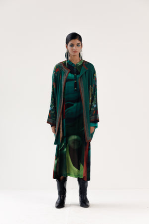 A-line dress painted in striking colours of art story. Modelled in crepe, it has a mandarin collar with half placket and handcrafted buttons.