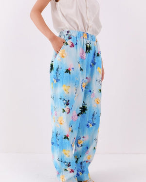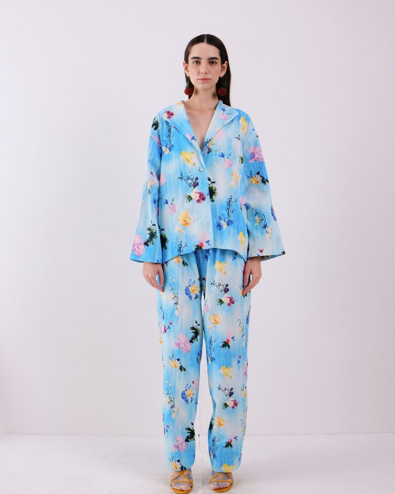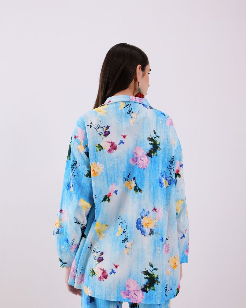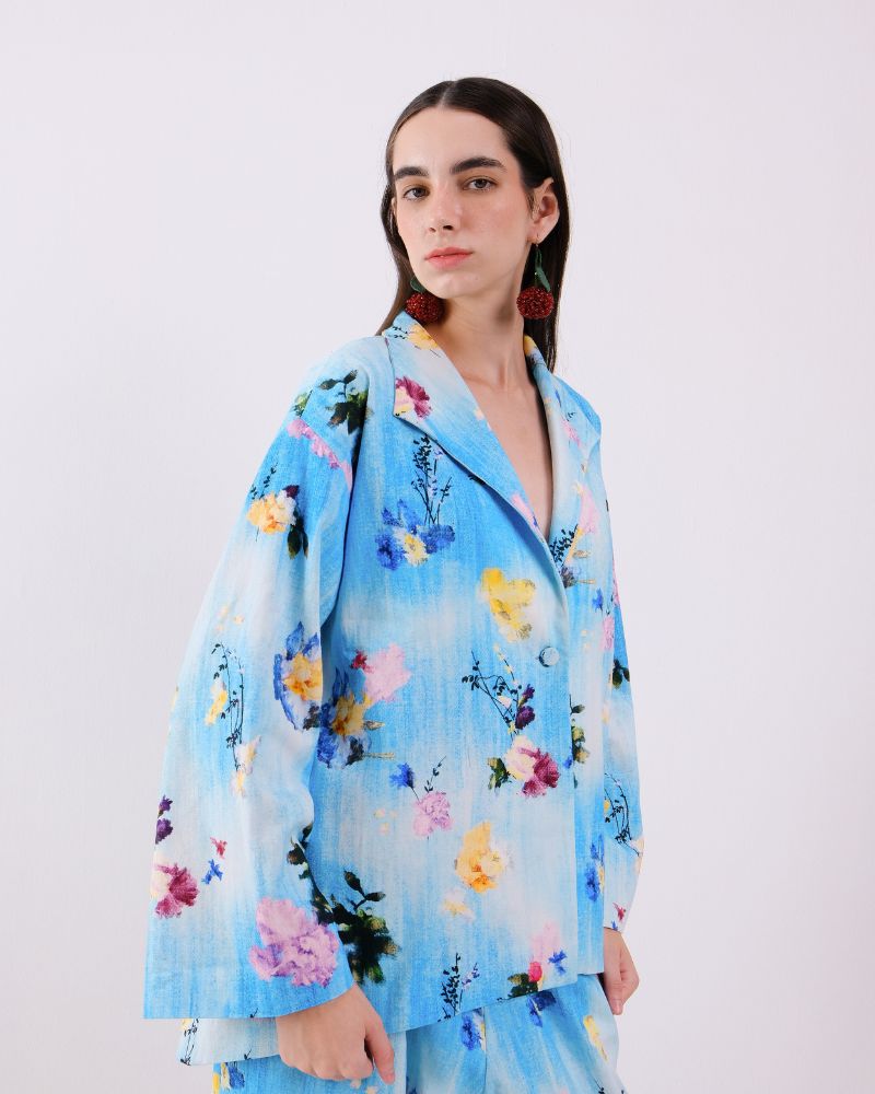 Bouquet story Jacket with block printed lining and in seam pockets in Denim.