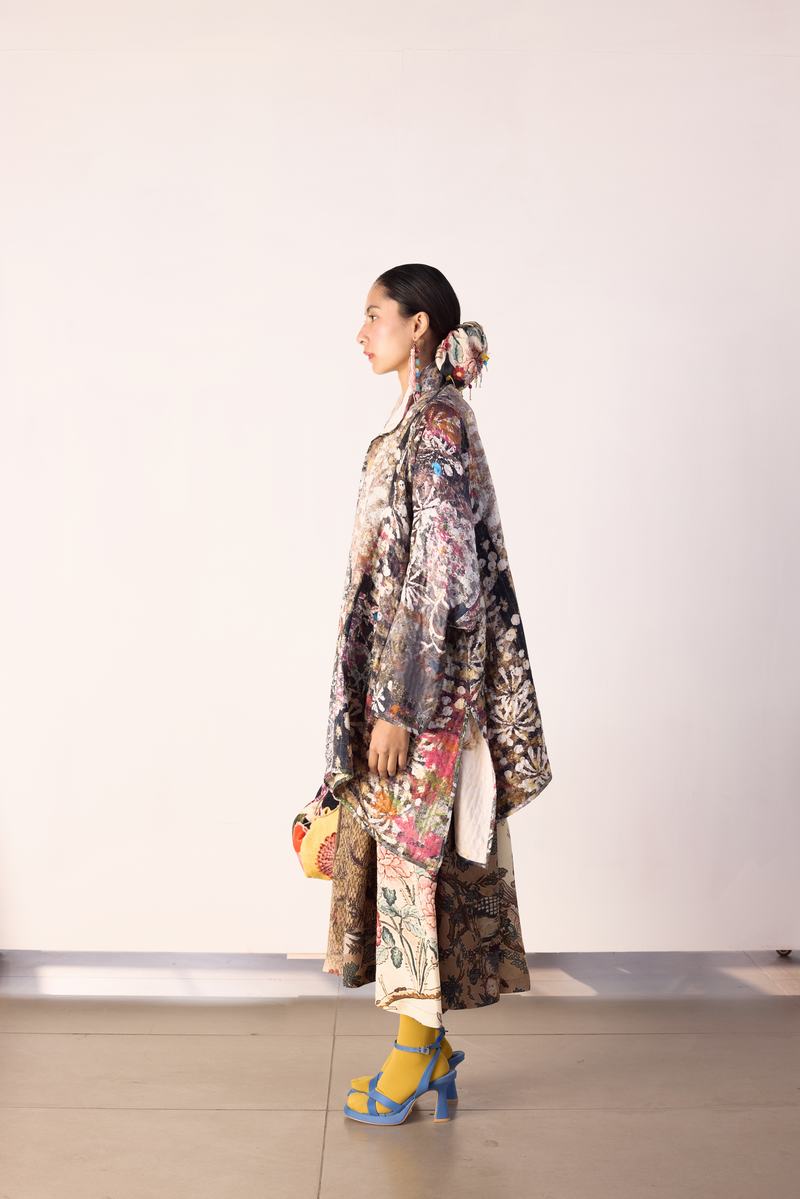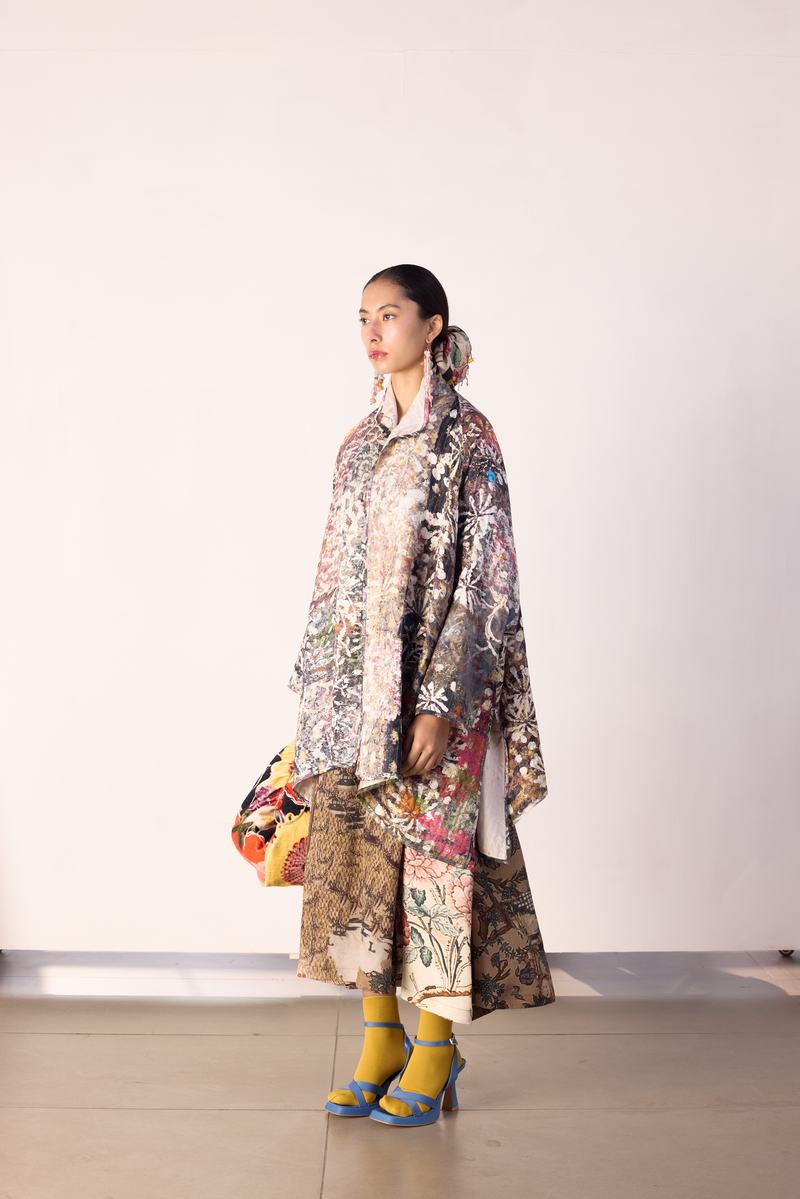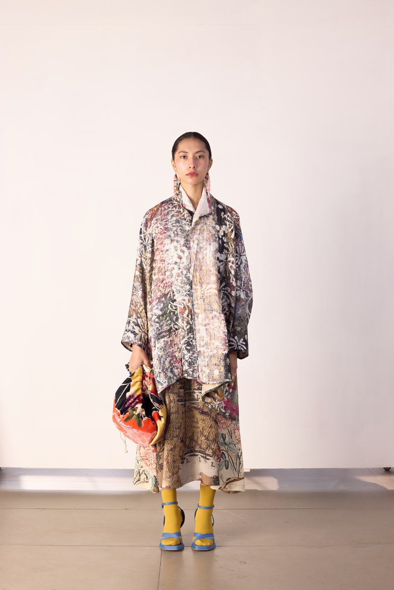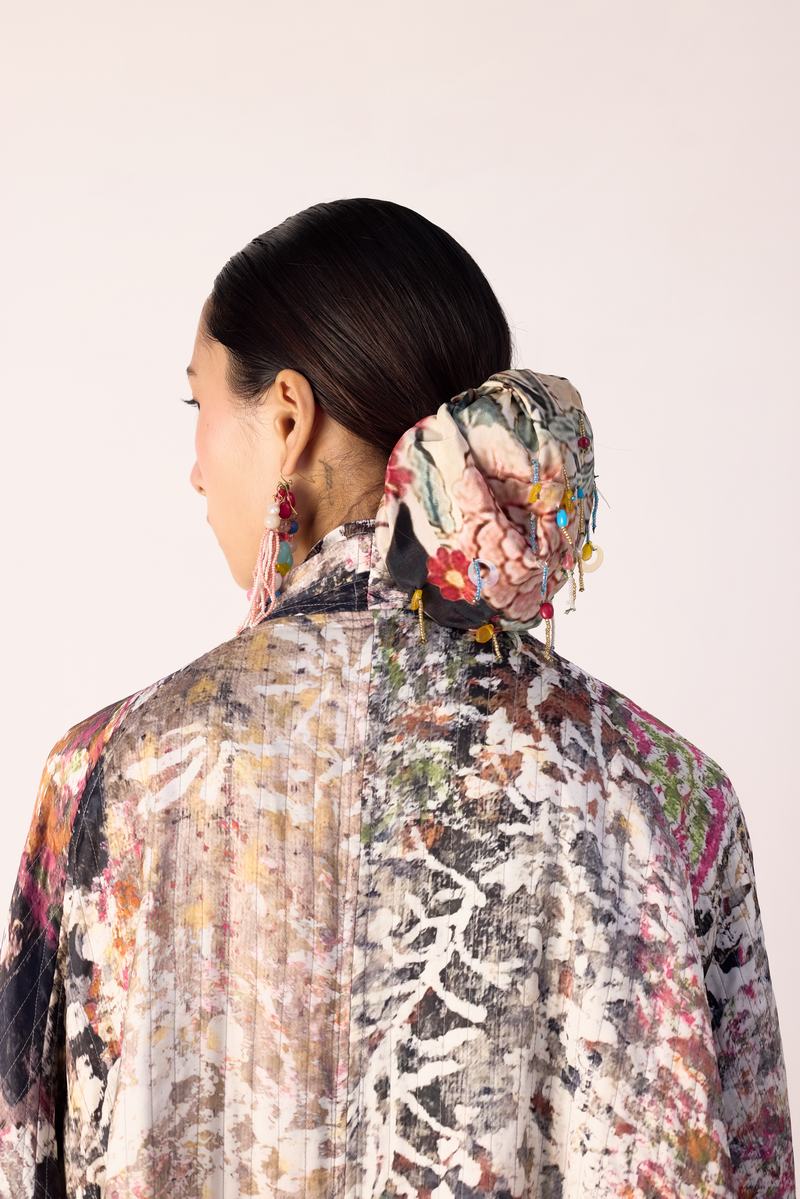 Impressionist reversible quilted jacket in cupro with printed lining.