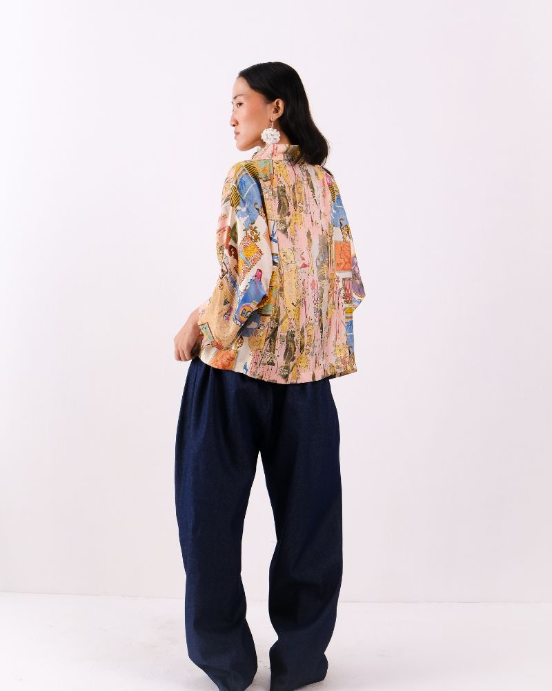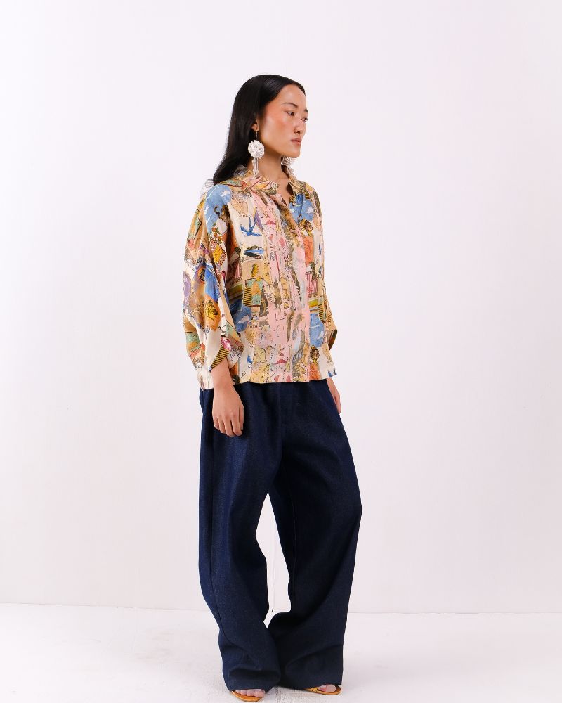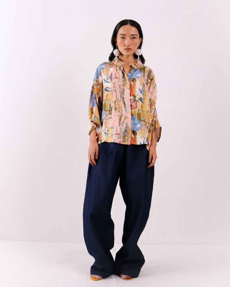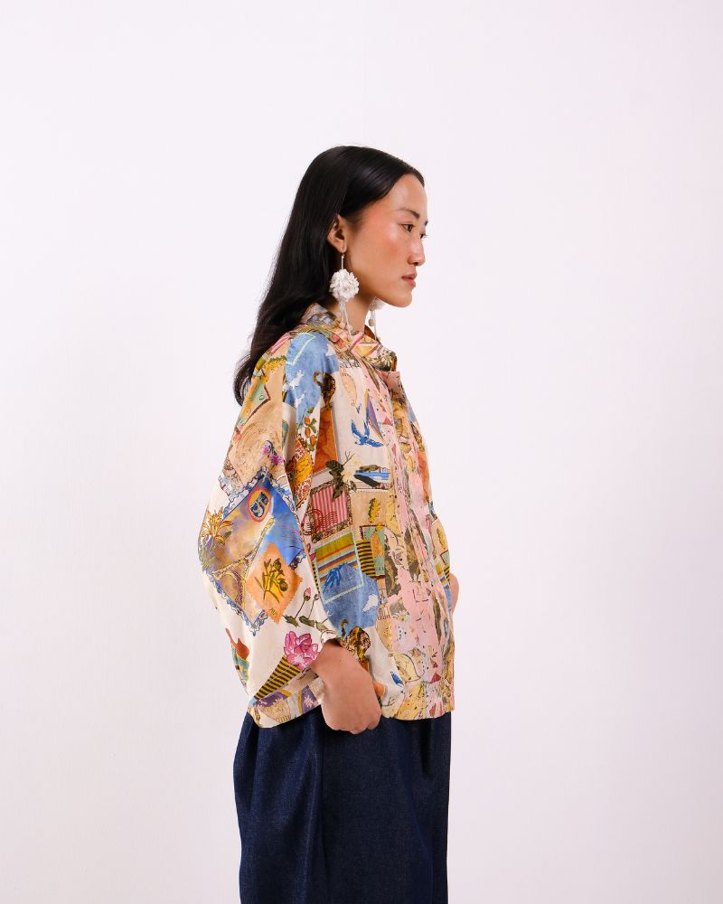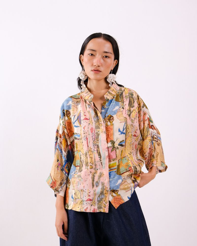 Atelier Collage mandarine collared button down shirt with concealed placket in Twill Silk.